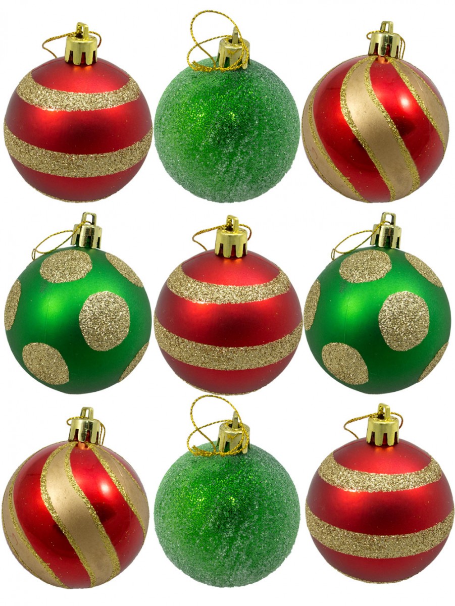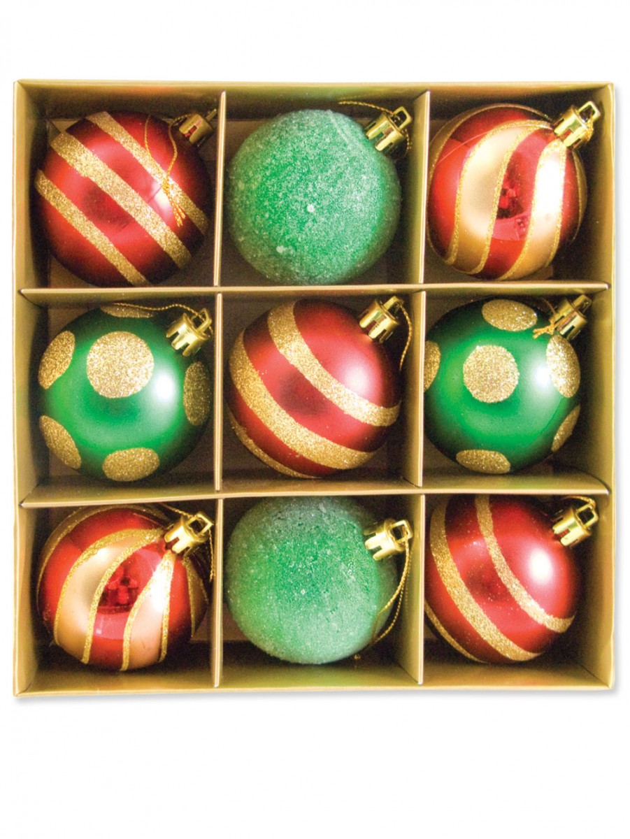 These nine baubles have been carefully designed to complement each other when arranged on your Christmas tree. Made from a thick plastic and measuring 60mm in size, they're sturdy and durable, which is a must when the kids are helping out with the hanging of the decorations. These gleaming globes have been hand-painted in a way that will truly bring out your Christmas spirit. After all, nothing says Christmas like red, white and gold! Each box contains four different styles, allowing you to mix and match the way you prefer. You'll receive two green globes carefully coated all over with gold glitter that match perfectly with their green and gold spotted siblings. There are also two varieties of red bauble on offer: one with three thick stripes of gold, and one with elegant Christmas-style golden swirls. Each box contains three of the former and two of the latter, ensuring that there's enough to go around the family. If you've been looking for a simple way to capture that Christmas cheer this year, look no further than these stylish Christmas baubles from the Christmas Warehouse. Christmas decorations are designed to get everyone in the spirit of giving - so add a touch of traditional colour and cheer with glamorous red and green baubles.