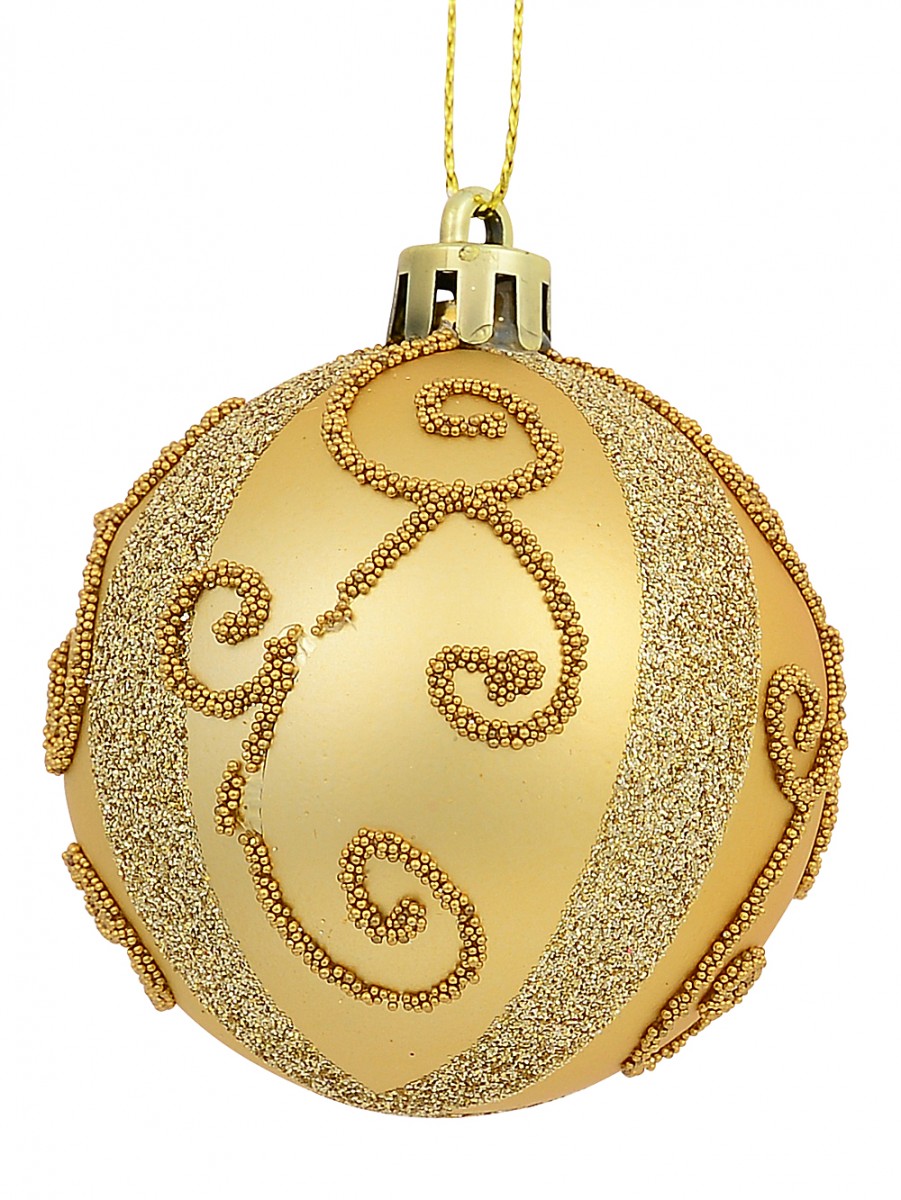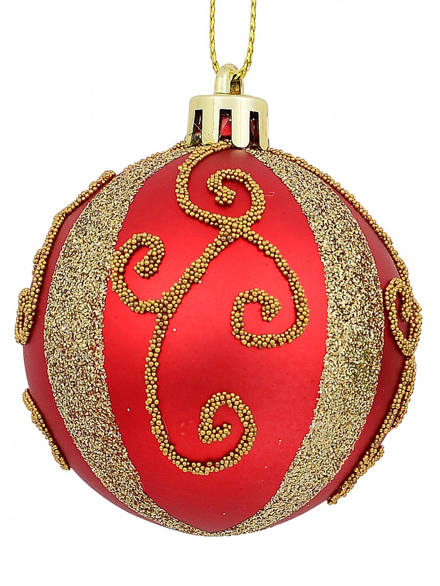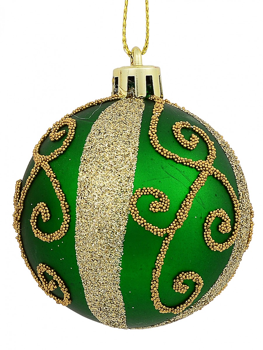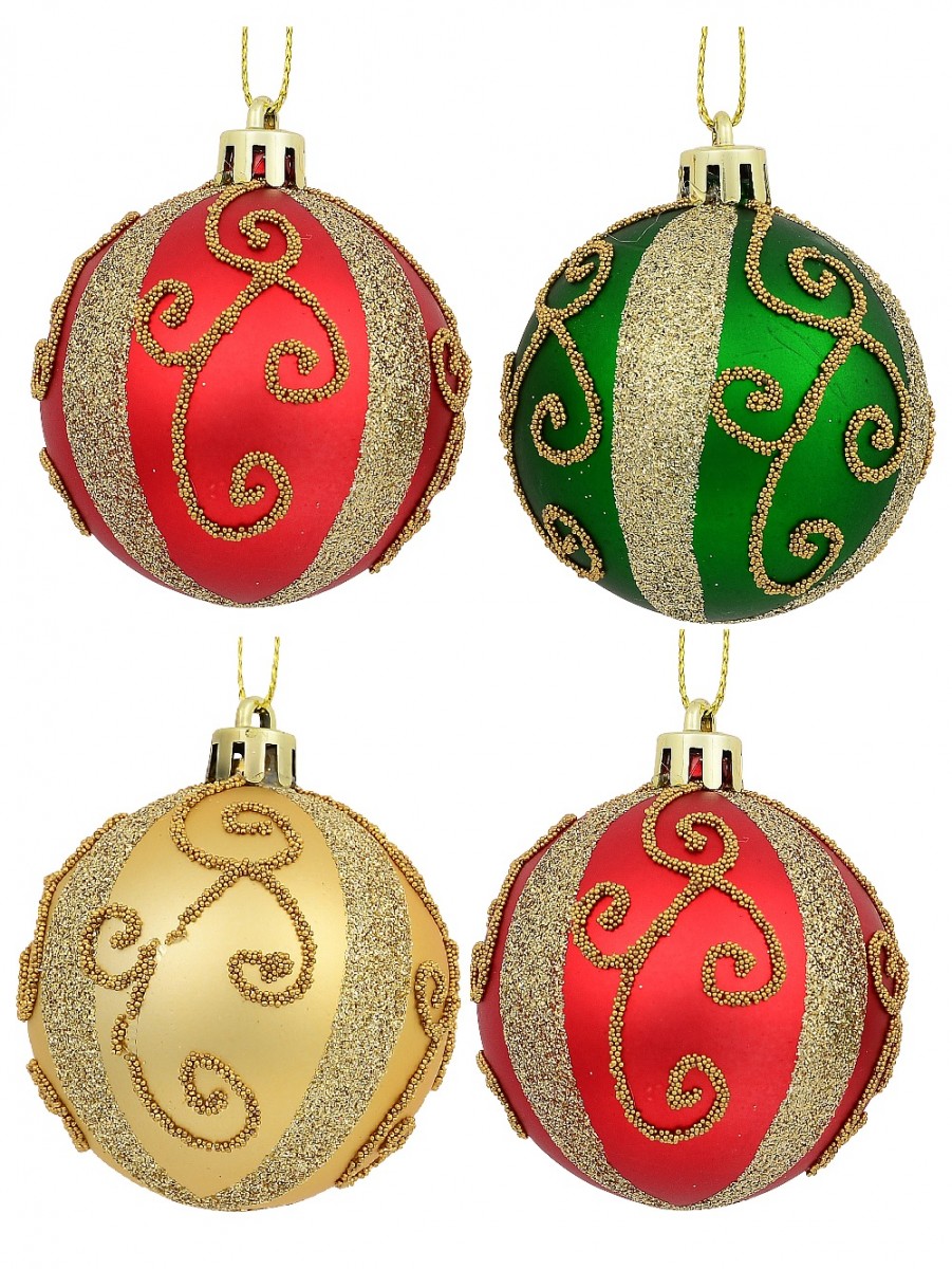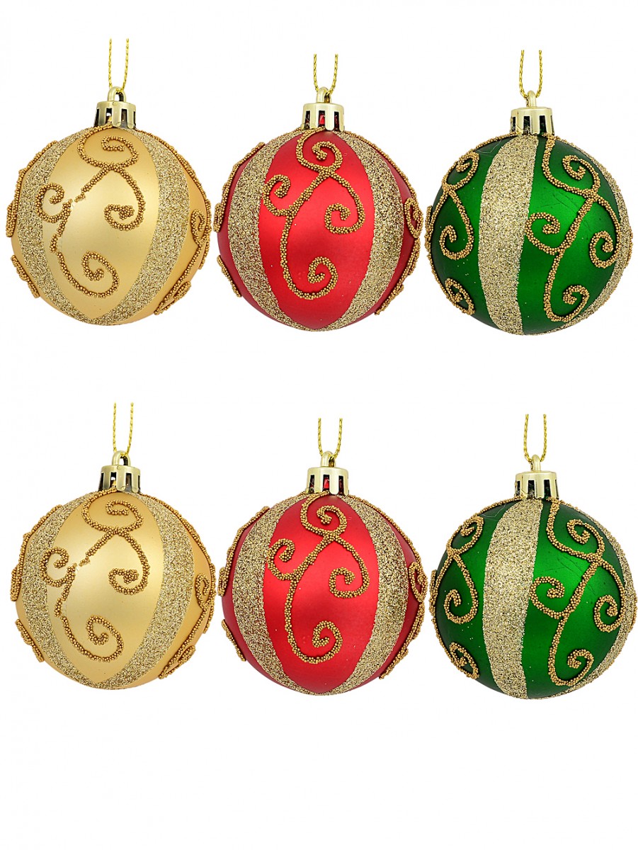 Have a fun filled Christmas celebration when you choose to decorate your Christmas tree and living spaces with as many of this Red, Green, & Gold Baubles With Gold Filigree Pattern & Thick Stripe as you can. This pack of six baubles consists of pretty baubles hued differently but ornamented in the same gold coloured filigree shaped glittered design. The pack contains two baubles luxuriously hued in deep shade of red, another two baubles hued in deep shade of green and third set showcase two baubles painted in matte shade of gold.
