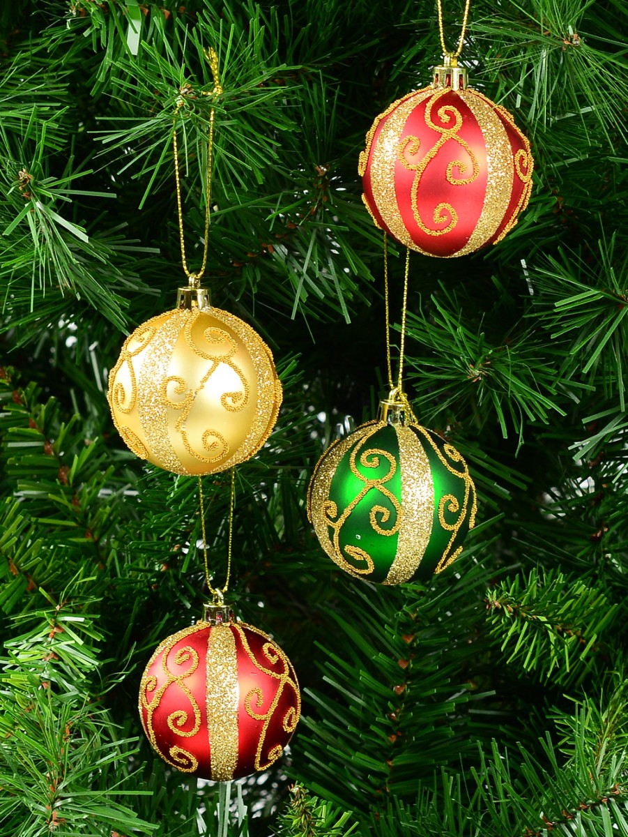 The Red, Green, & Gold Baubles With Gold Filigree Pattern & Thick Stripe is specially designed to add grand festive ornamental impact to every living and working spaces where you intend to decorate and/or celebrate this coming Christmas. To make this happen, this pack consists of six baubles which contain baubles beautifully hued in traditional colours of Christmas - gold, green, and red.