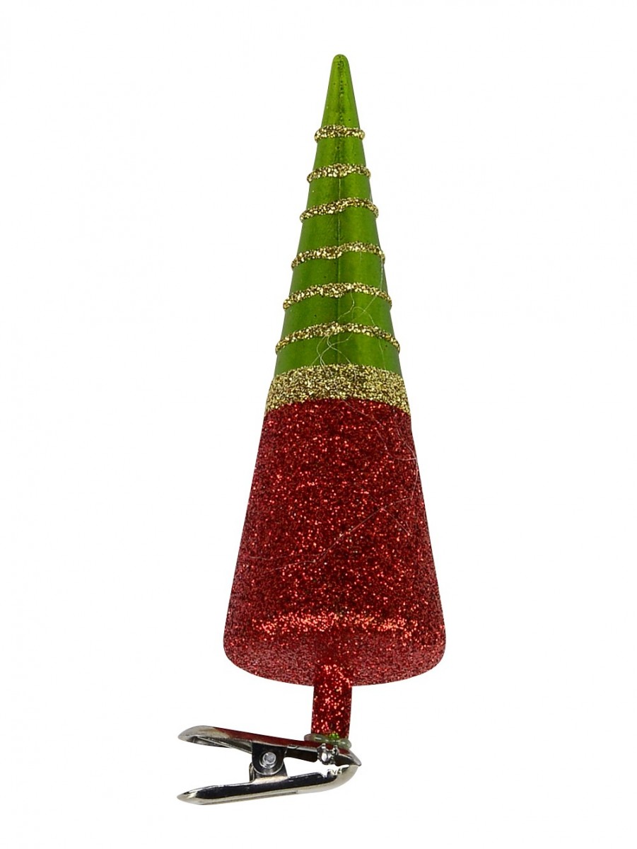 Decorate your home and Christmas tree in style using this cone shaped tree ornament. It is particularly suited for Christmas decoration because it is coloured in three assortments of Christmas' traditional colours - red, green and gold. The base of the cone tree is covered in crimson red glitters after which are alternating gold glitters decorating a green background. The tree's cone shape is inspired by the shape of an actual Christmas tree which is often shaped like a cone. Attached to the base of this ornamental small cone shaped tree is a shiny silver coloured stainless clip with which this ornament can easily be used. Why not order as many as necessary and decorate that house and office with a vibe of glitter.
