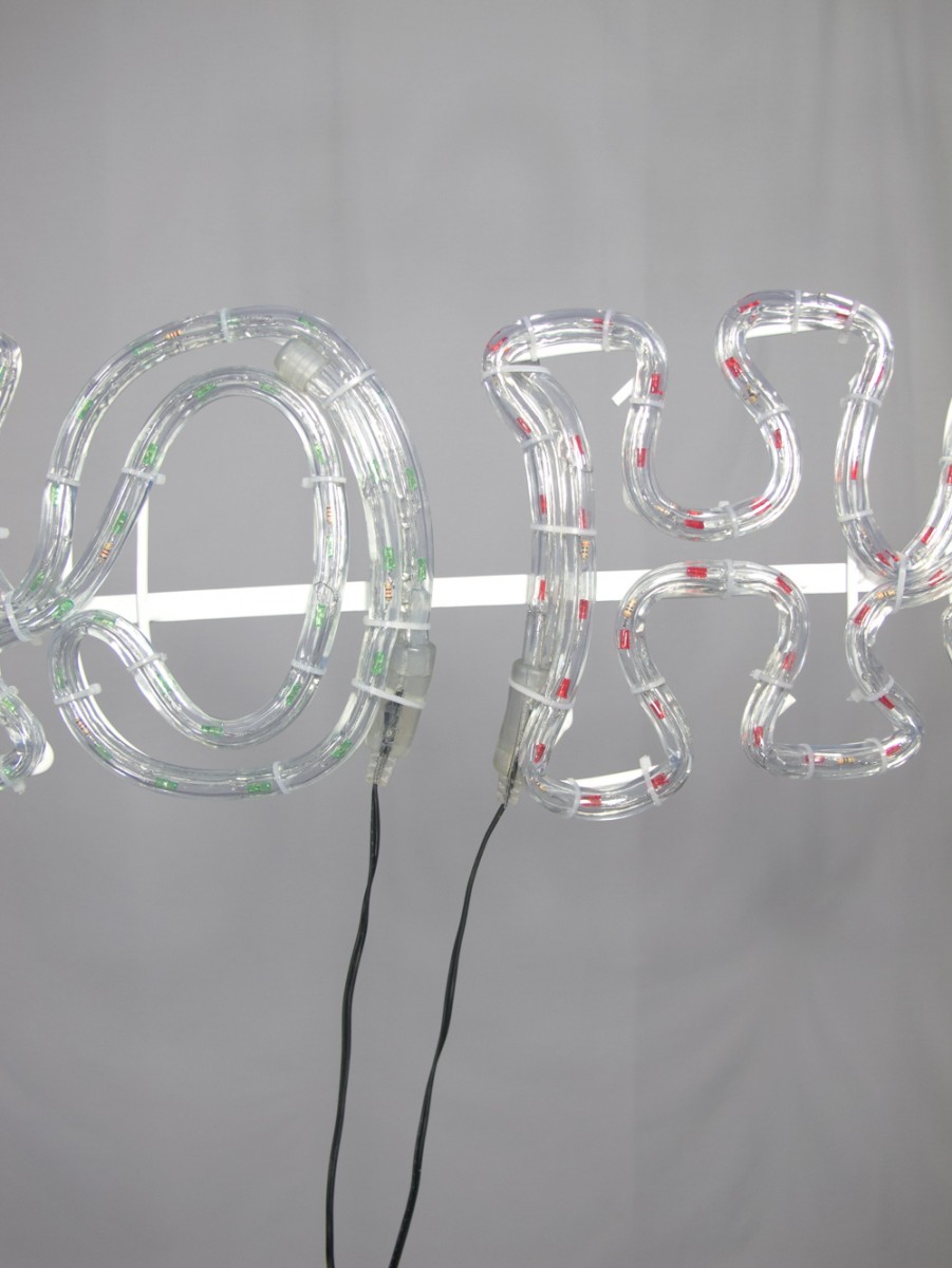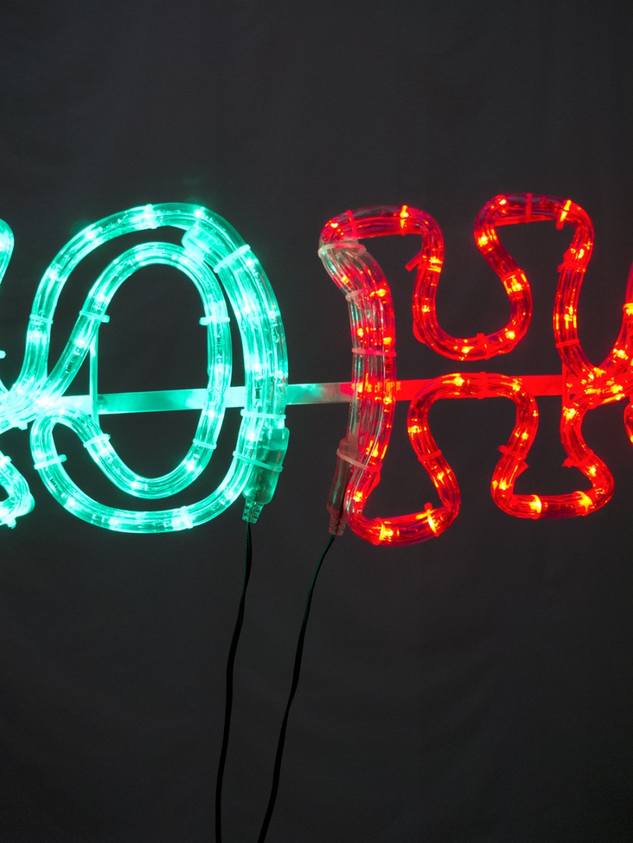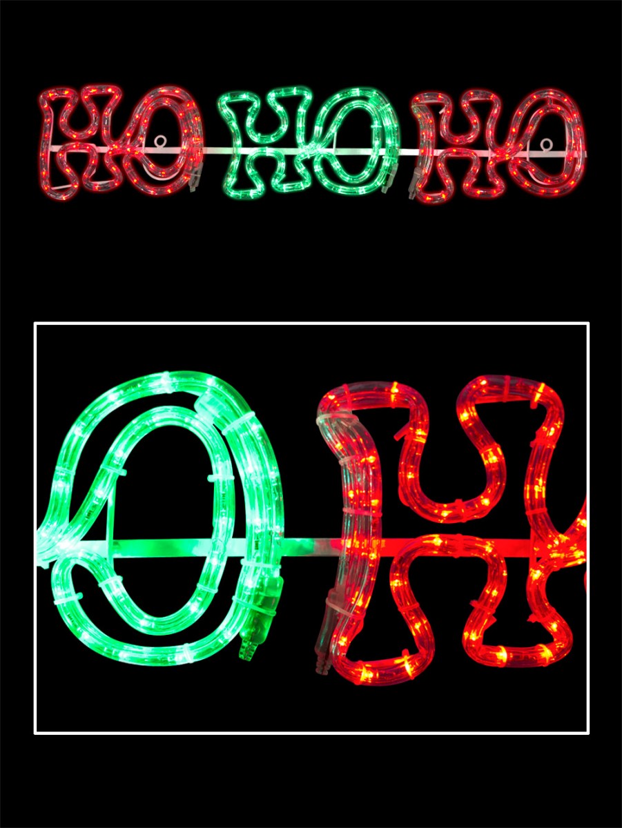 Our delightful Red and Green Ho Ho Ho sign will bring Santa's wonderfully jovial spirit to your house when you place it on your front door. At almost 3 feet long, it's a brilliant way to welcome your holiday guests! The Green and red LED rope lights alternate among letters to create the Ho Ho Ho silhouette. Also, the lights are protected by heavy duty housing that's tough against weather, so you can enjoy your lighted ornament for many years. It has flexible tubing that can be gently folded for easy storage when not in use.