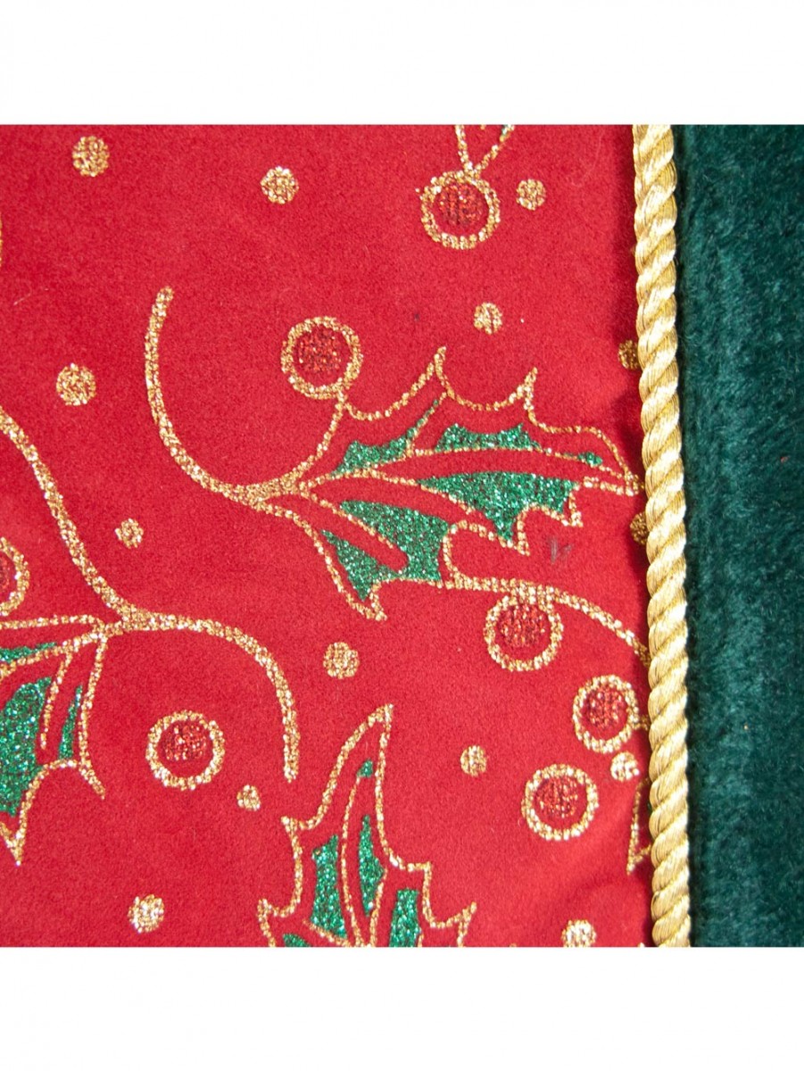 A pattern of holly is printed on a red cloth that is trimmed with a deep green velveteen material with a golden cord. The clusters of holly in the pattern are outlined in gold as well. A Christmas table runner such as this one adds to the effect of a table full of holiday dishes, be it with or without a table cloth. But a table runner can also be draped over the top of a bookshelf or used to line the fireplace mantel for putting Christmas decorationsations on top of. Complete the look with a collection of Christmas stockings. The classic red and green colour scheme goes well with most other holiday colours and really brightens up a drab piece of furniture.