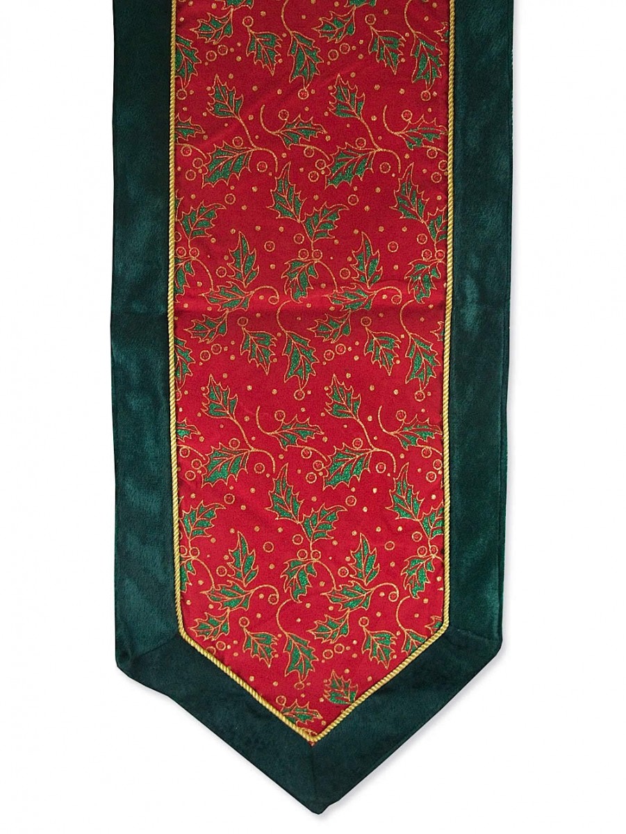 The red and green holly patterned table runner is an embellishment for furniture during the holidays. This red and green rendition makes an exquisite setting place for Christmas decorationsations and feasts.