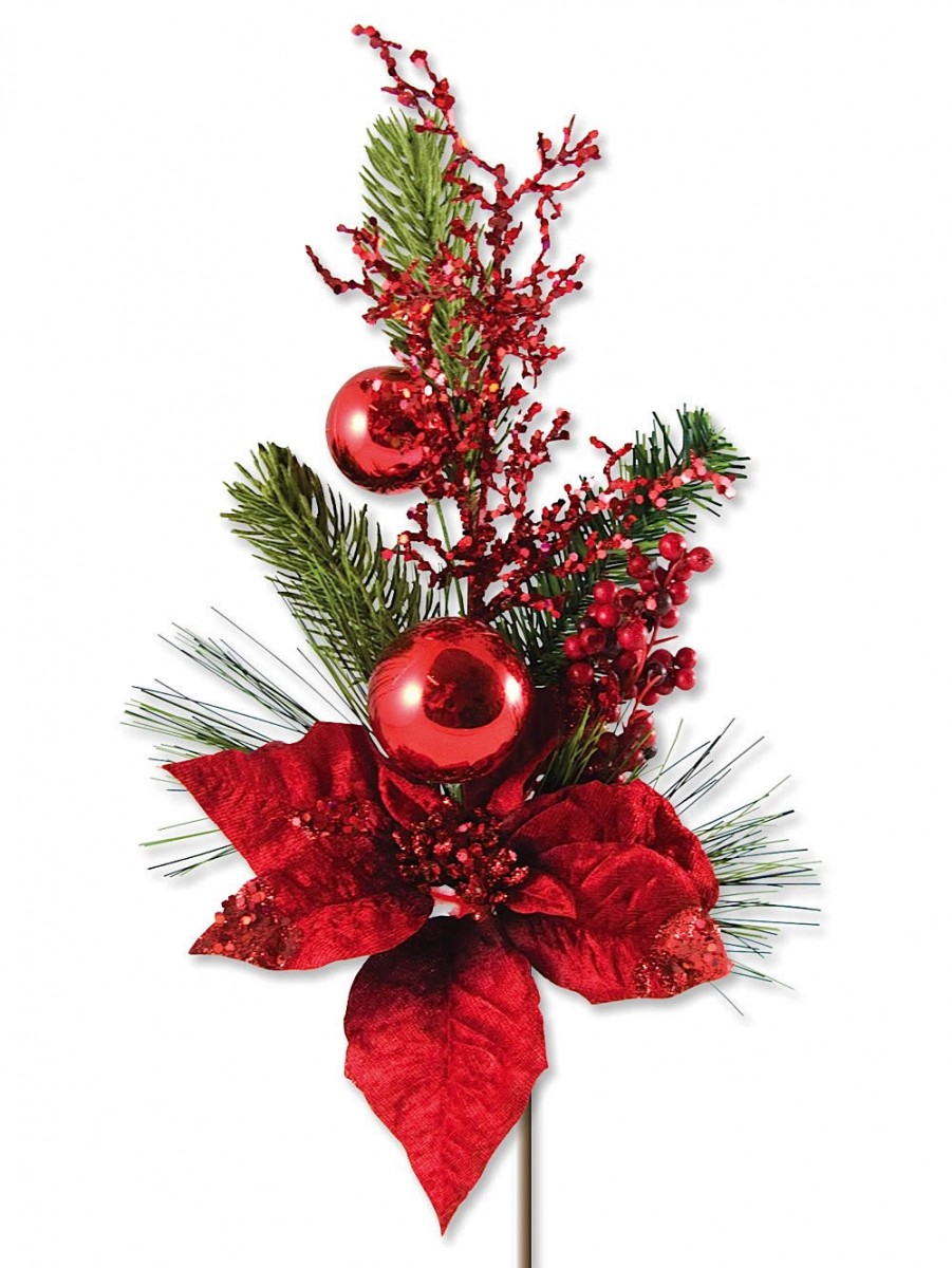 Christmas picks and tree decoration such as poinsettia flowers offer an instant aesthetic lift to any homes, workplaces and other venues. Combine lovely and eye-catching themed poinsettia decorations with baubles and what do you get? Everybody is sure to love the accentuating effect of bauble and poinsettia duo in amazing yet practical piece. Picks - Poinsettia Spray With Bauble & Assorted Decorations - 47cm is the top yuletide season ornament to begin the holiday decorating galore. This item is individually sold. One Christmas pick is composed of fiery and deep red poinsettia decoration made from high quality and durable materials. The poinsettias are accentuated with glittering effects for an added eye catching finish. It is a perfect ornamental yuletide piece which is combined with matching red Christmas baubles in metallic and shiny finish. There are deep red and glittering poinsettia picks for variation. To add assortment, the 47cm piece is blended with deep green twigs and pine leaves.