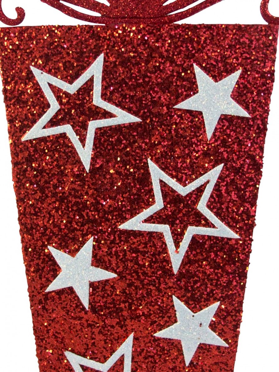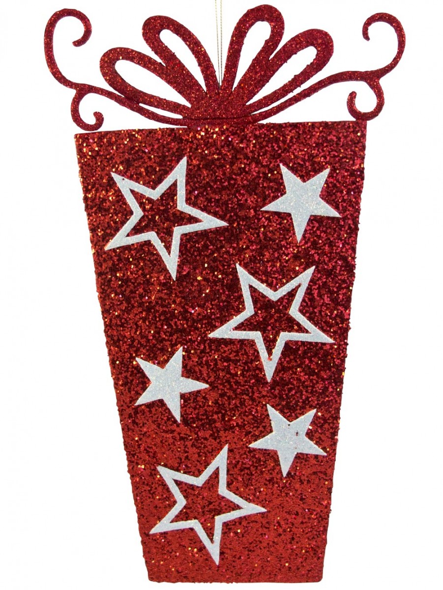 It features a 2D glittered red gift box display decoration with white stars made from soft solid material and is sold individually. If not on the Xmas tree, it can look just as great when used in any other place. Like hanging pretty from windows, ceilings, mantelpiece, attached on walls, entryways and anywhere else you fancy seeing this fabulous piece of decorative handiwork. Suitable for both domestic and retail displays, this product can be shipped across the world and will make any space look much more cheerful and colourful.