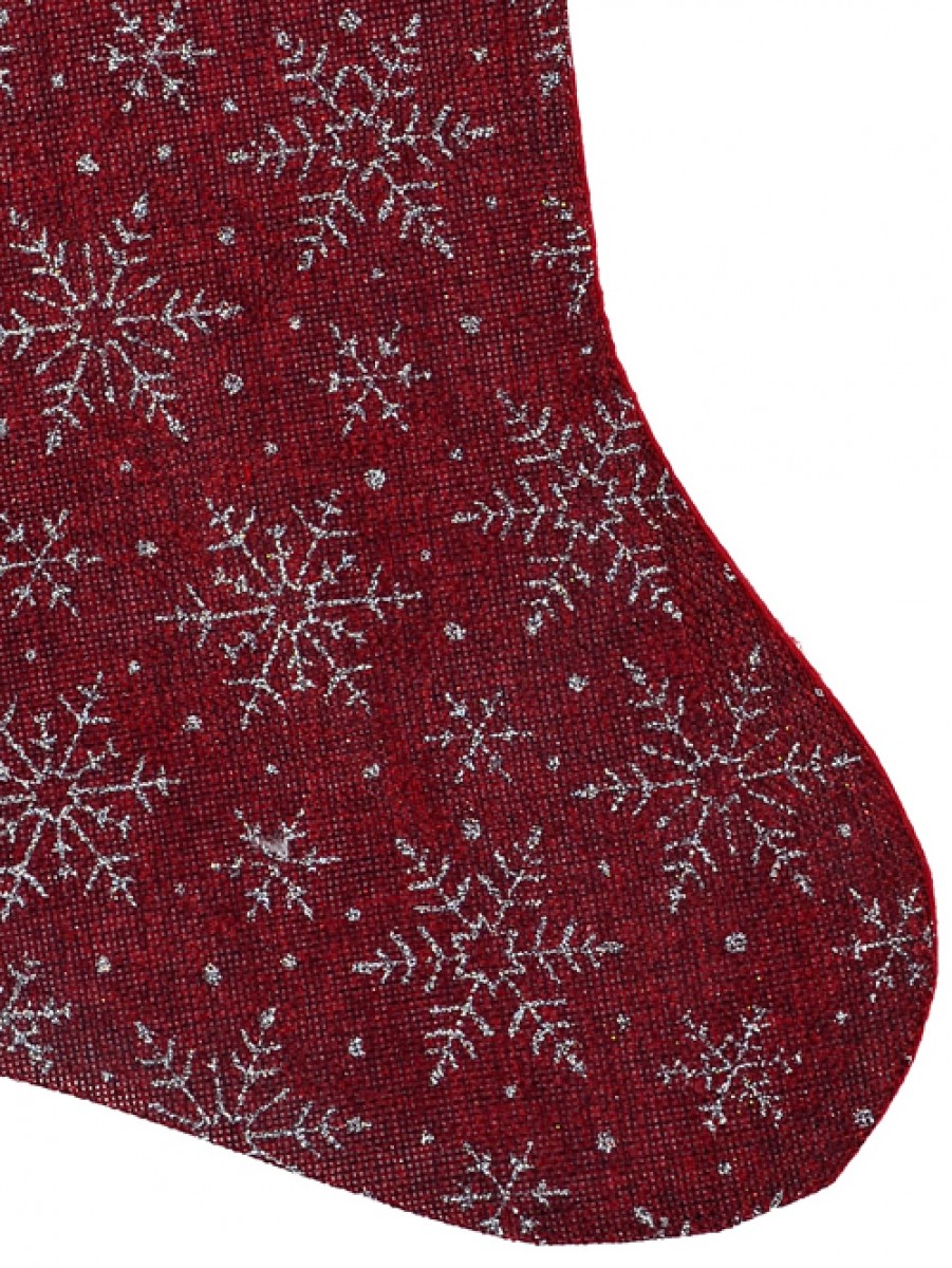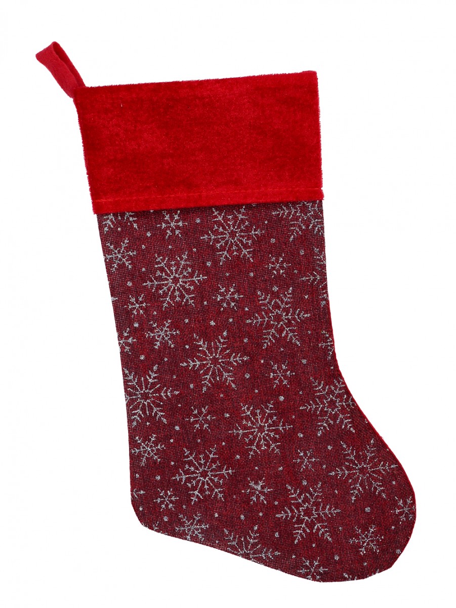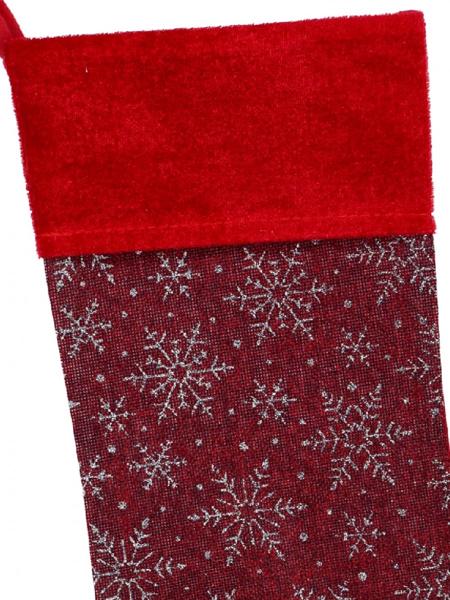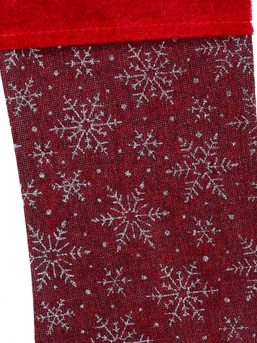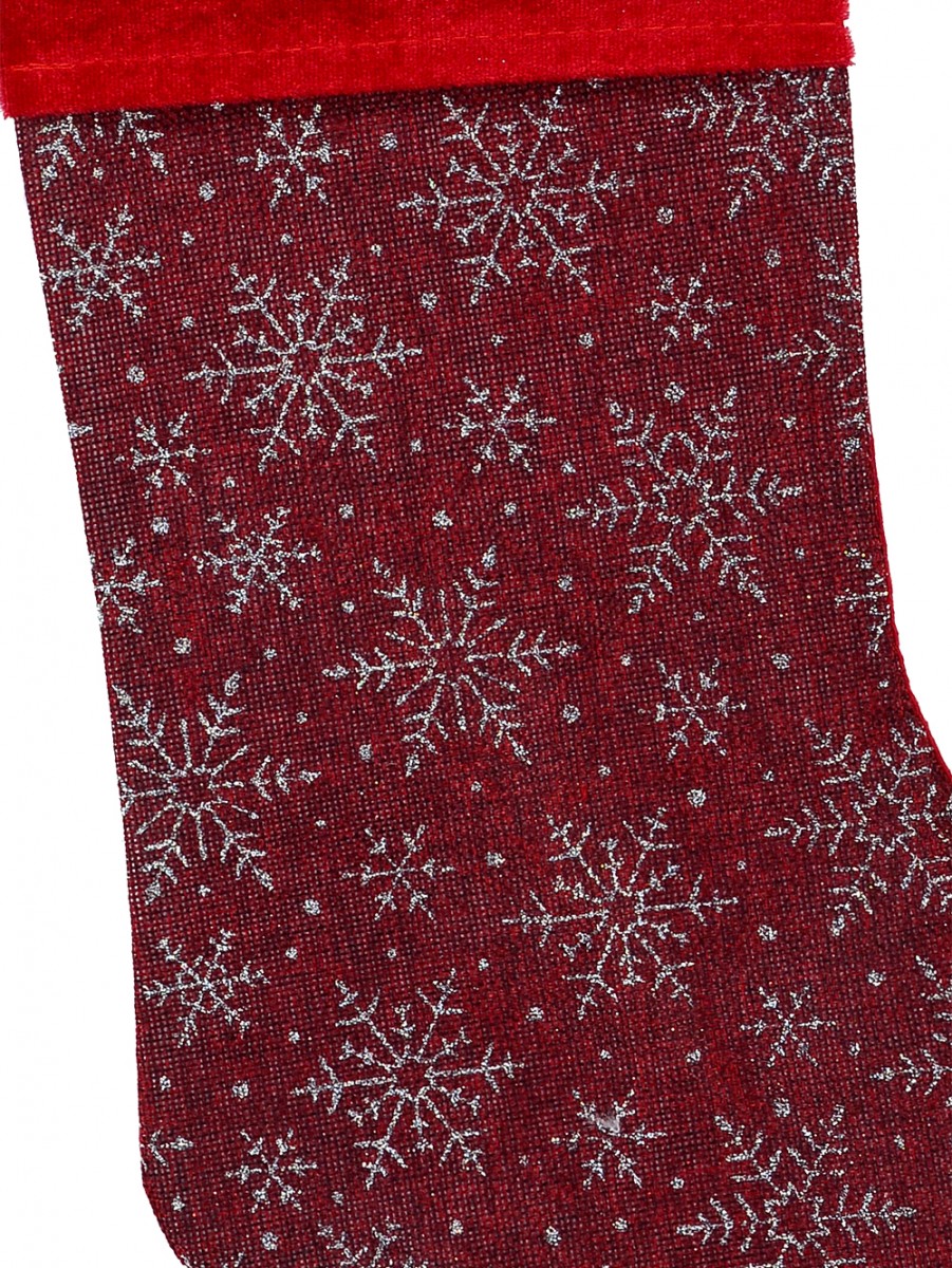 Liven up the interior decor of your home and office this Xmas when you buy this Red Soft Burlap With Silver Glittered Snowflakes Pattern & Velvet Cuff Stocking. This traditional Christmas stocking is made from high-grade material and exhibits the natural motif of a snowflakes design which is done in white over a maroon red fabric.