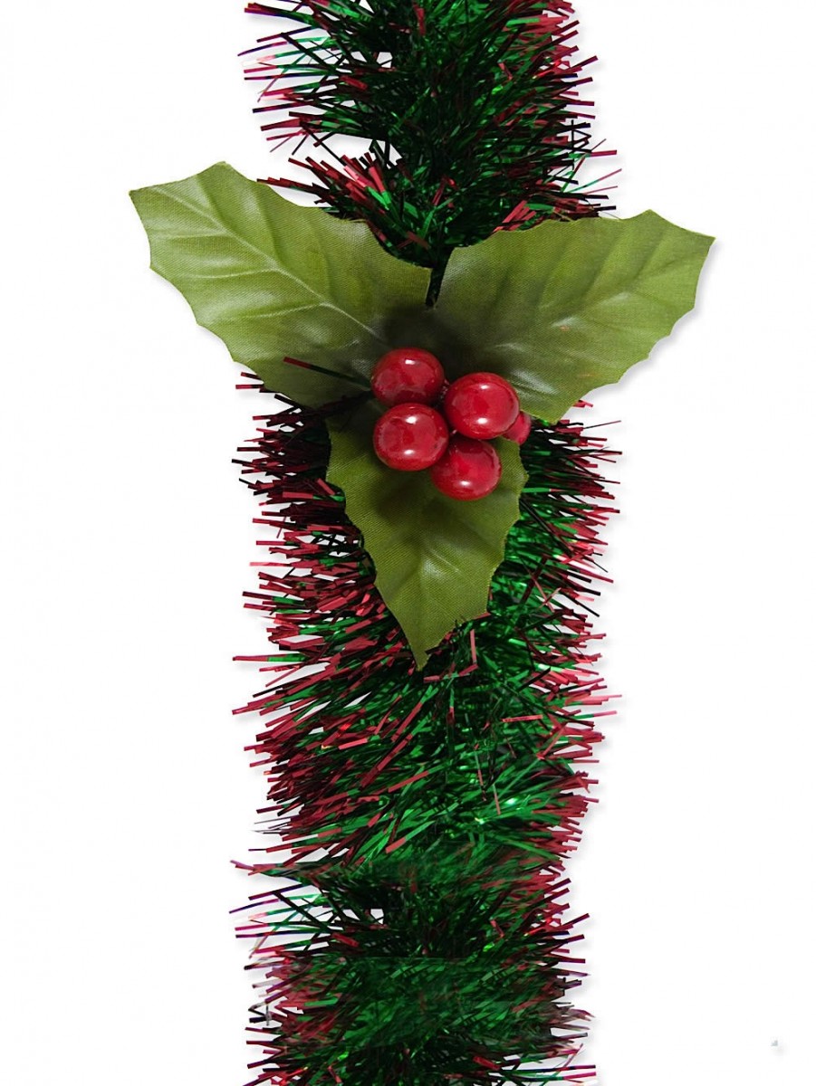 The red and green holly leaves garland is a shiny combination of the two favorite Christmas colours, red and green, with two favorite Christmas plants, pine and holly. Why twist together and then clean up pine needles and dead holly when these garlands are so much more sparkly? These uniquely coloured garlands of tinsel are green with red tips. A small bouquet of holly is positioned at a regular intervals along the tinsel. The cluster of red berries surrounded by a frame of green holly leaves is offset by the green and red hue of the shining strands. The red and green holly leaves garland is suitable for wrapping around all manner of edges including banisters, ceilings, and trees. One could even add a strand of green and red Christmas lights into the mix to add to the dramatic air. Perfect for the Christmas decorationsator with an eye for contrasts.