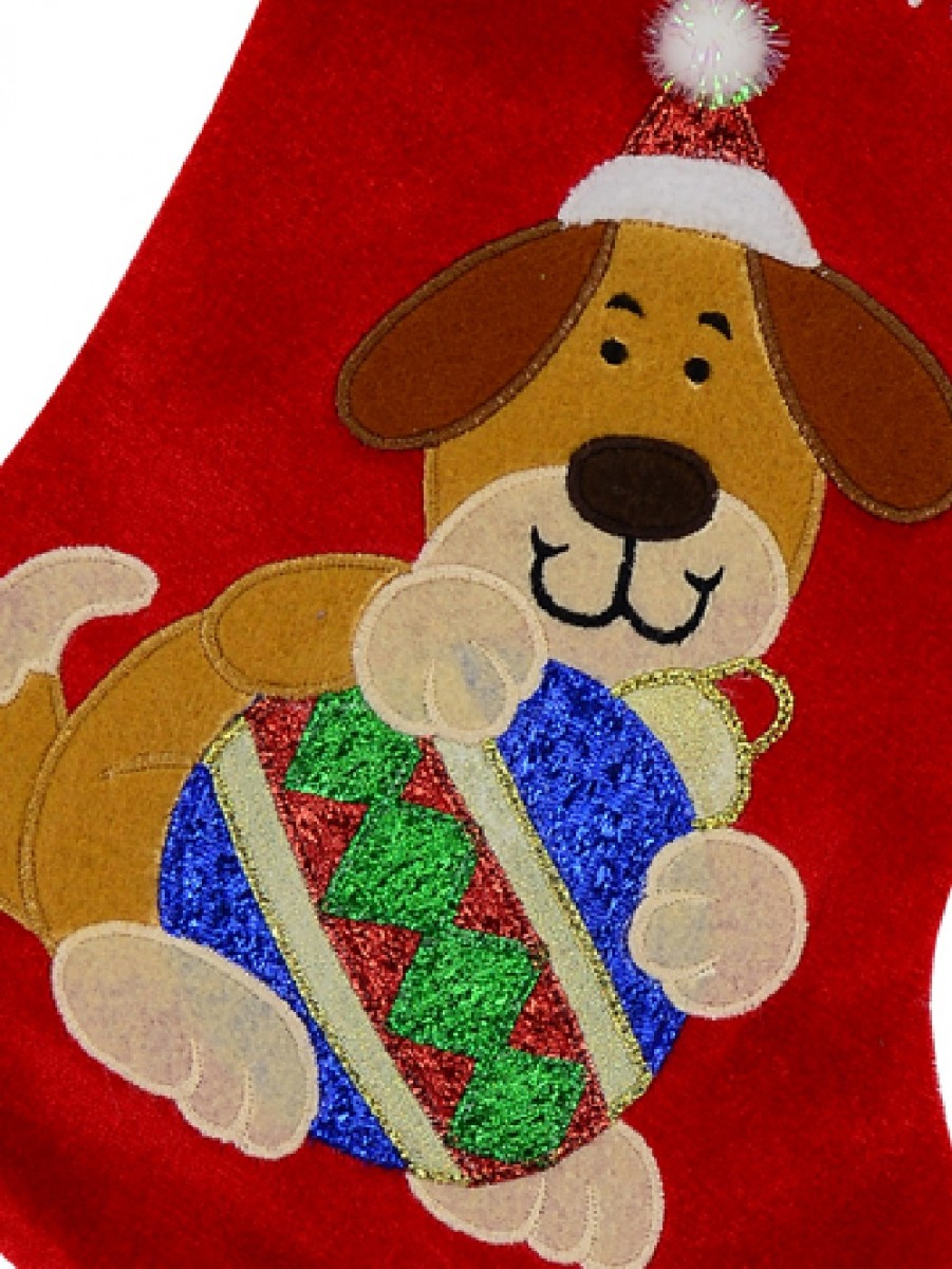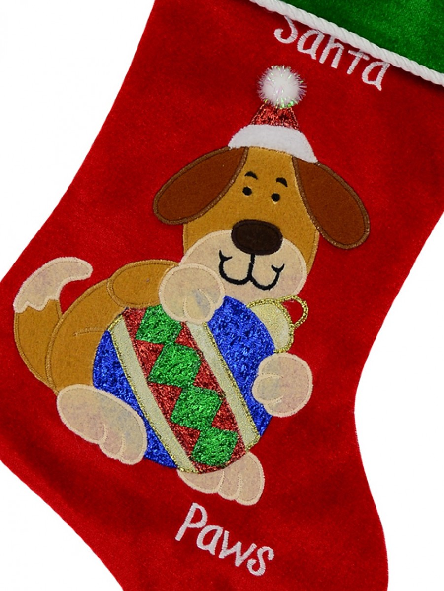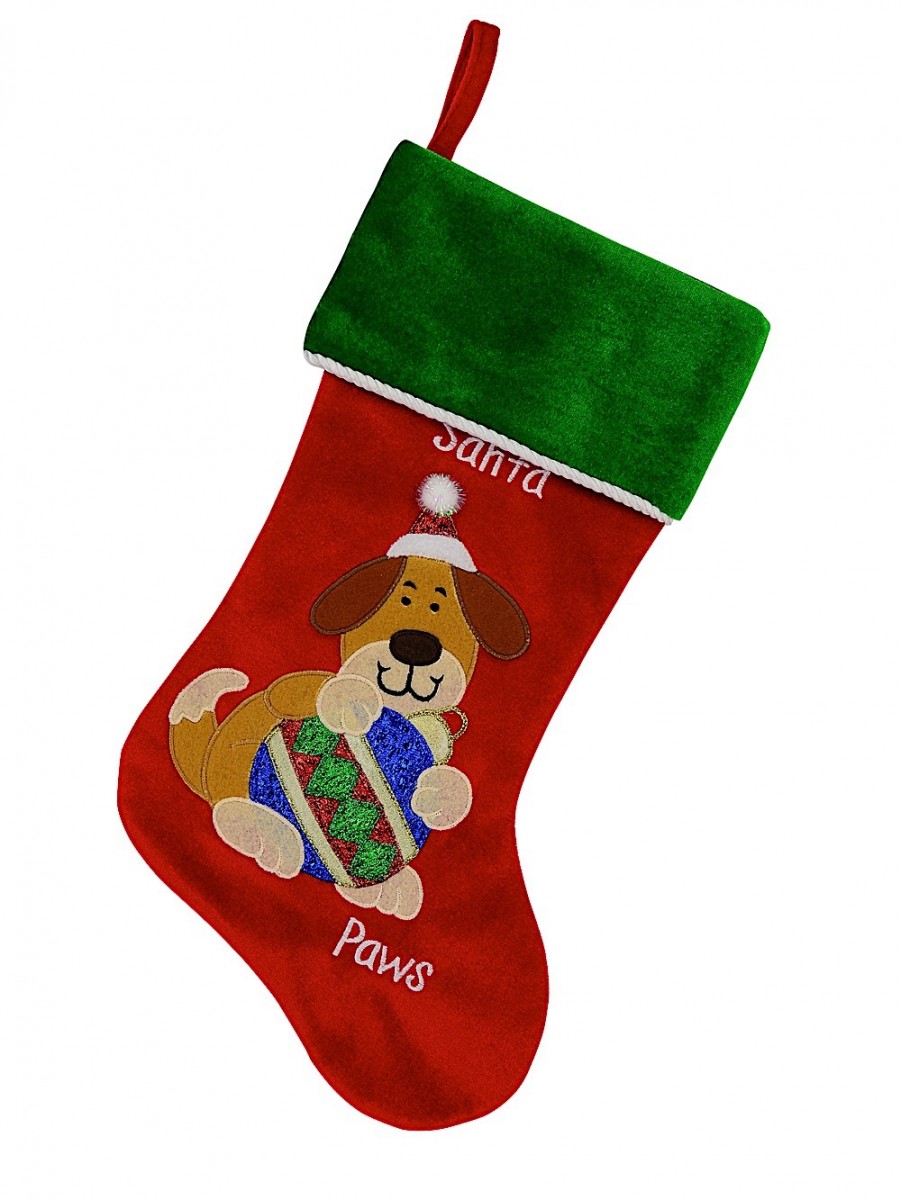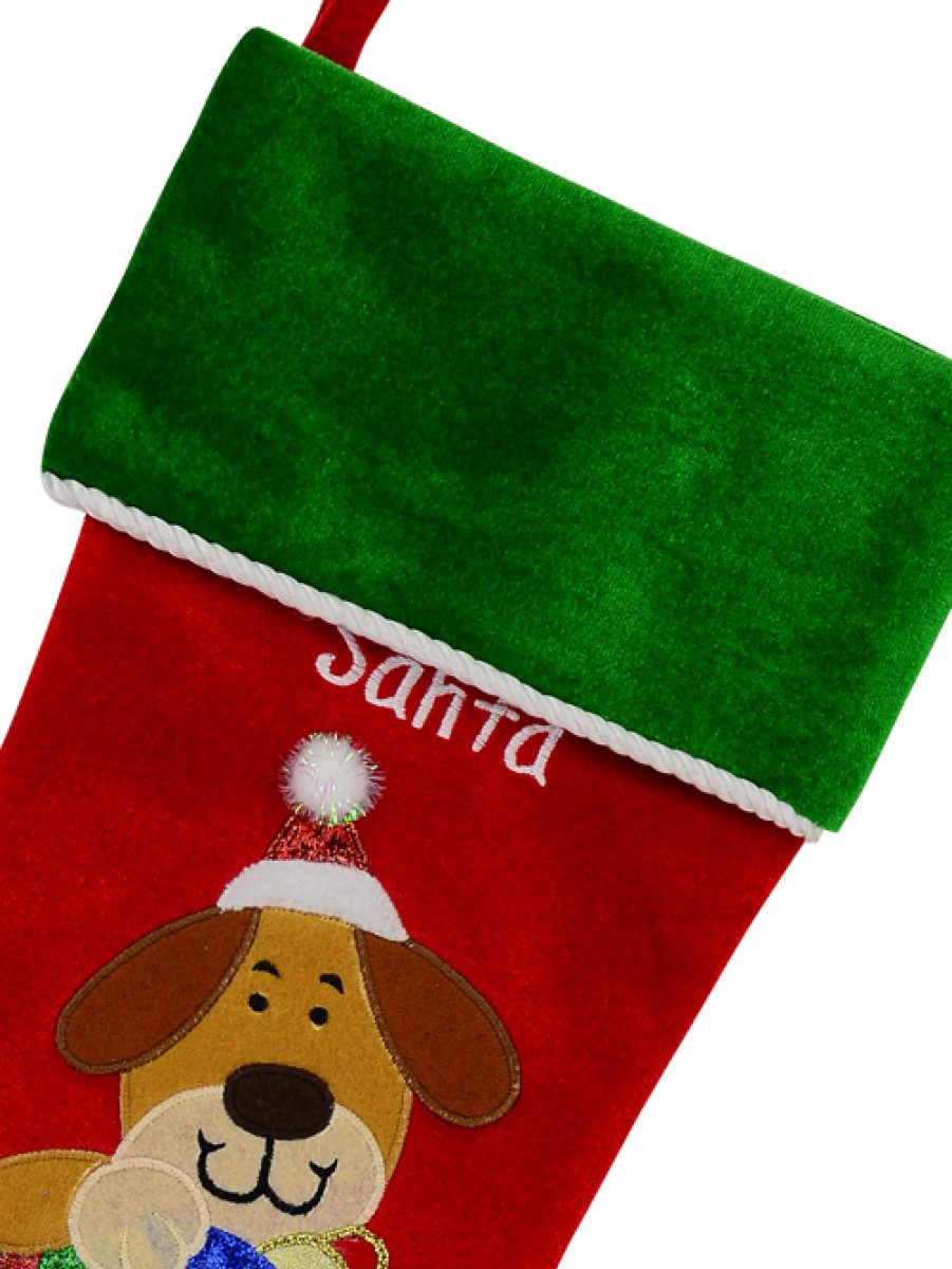 Whether your naughty yet adorable pet may have earned a new leash, yummy snacks or a new toy, this large stocking crafted from smooth velvet is the perfect piece for stowing all of your pet's special holiday treats. This red stocking has a dark green cuff with white trim and you may add your own special touch by personalizing the cuff with the name of your dog or puppy! The red loop makes it easy to hang on the dog house, Christmas tree or mantle and it makes the ideal Christmas gift to a dog owner.