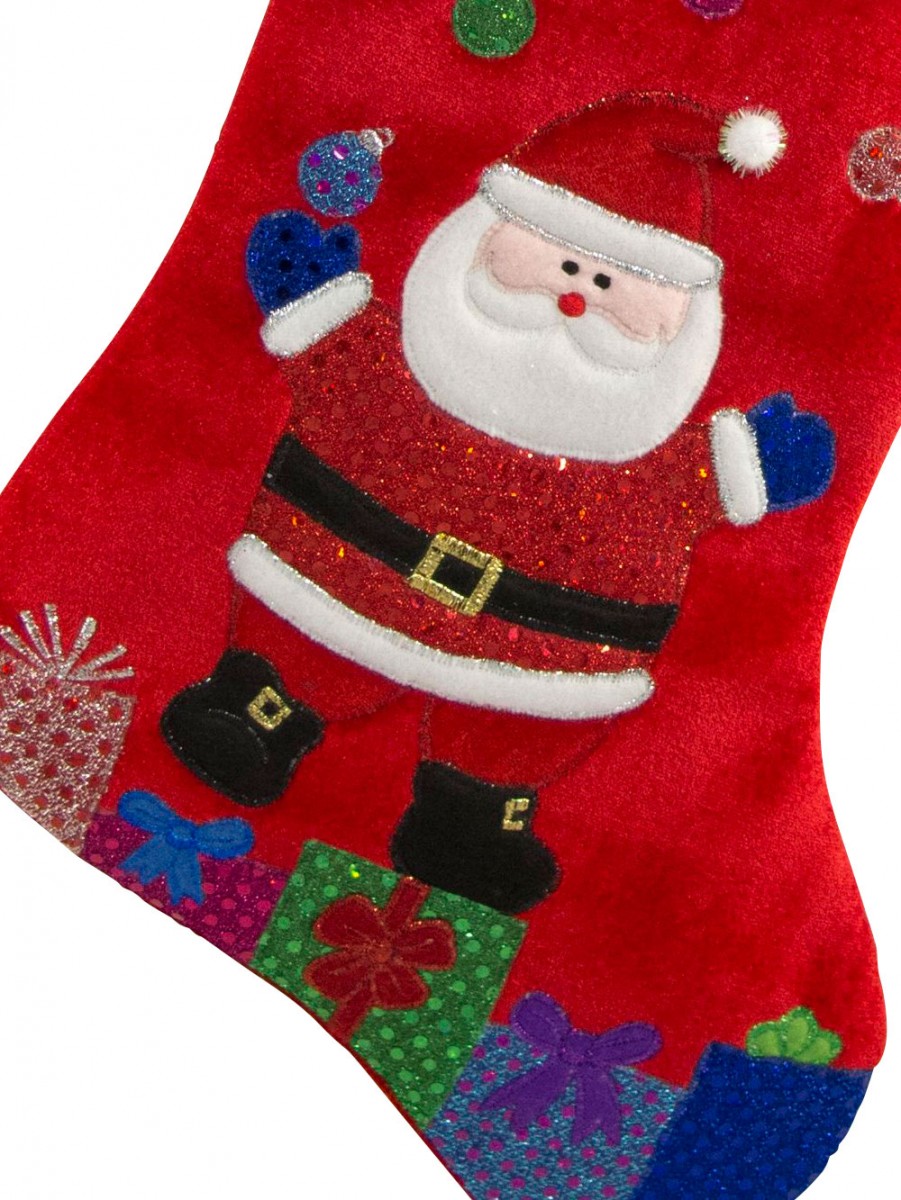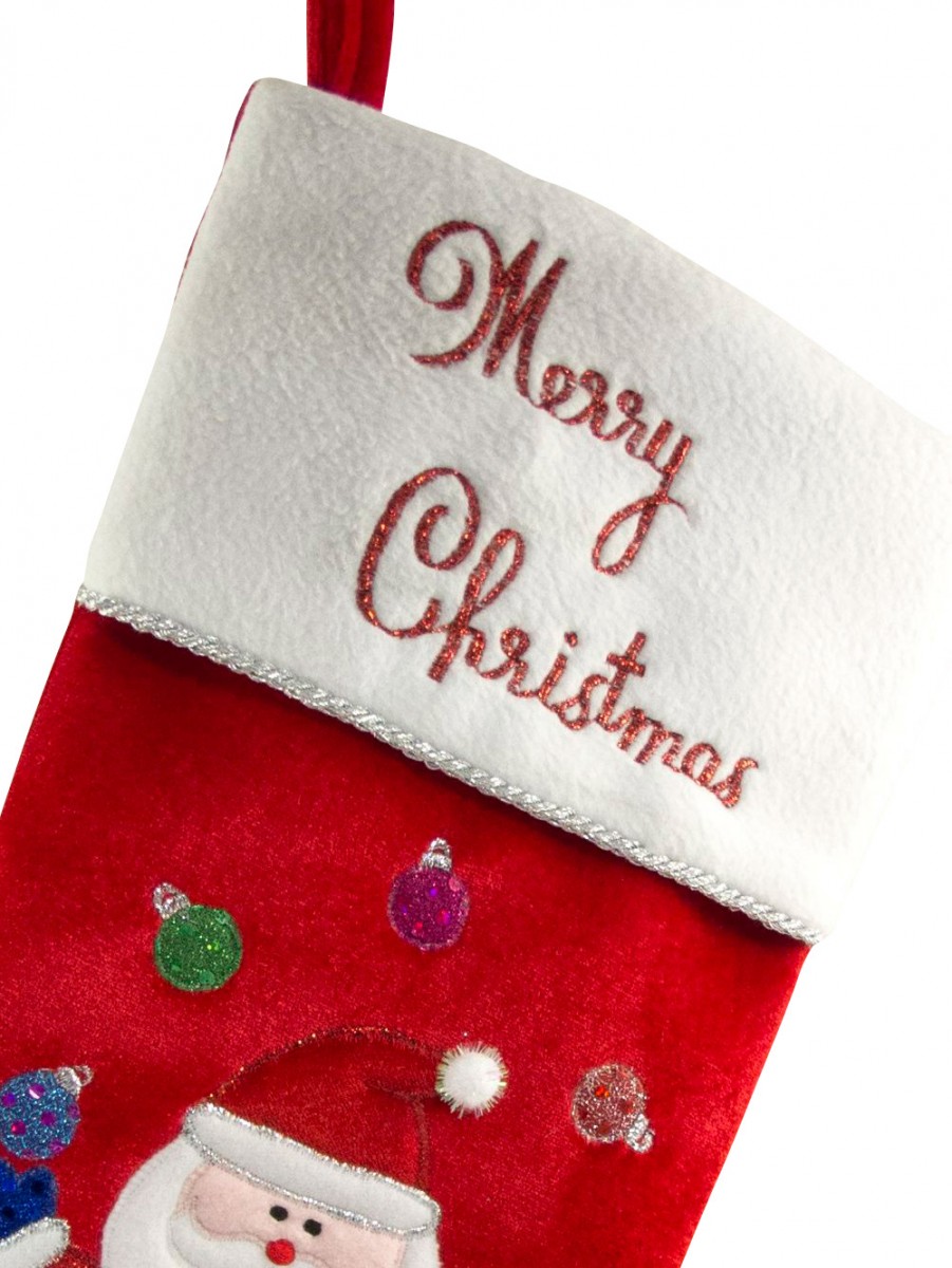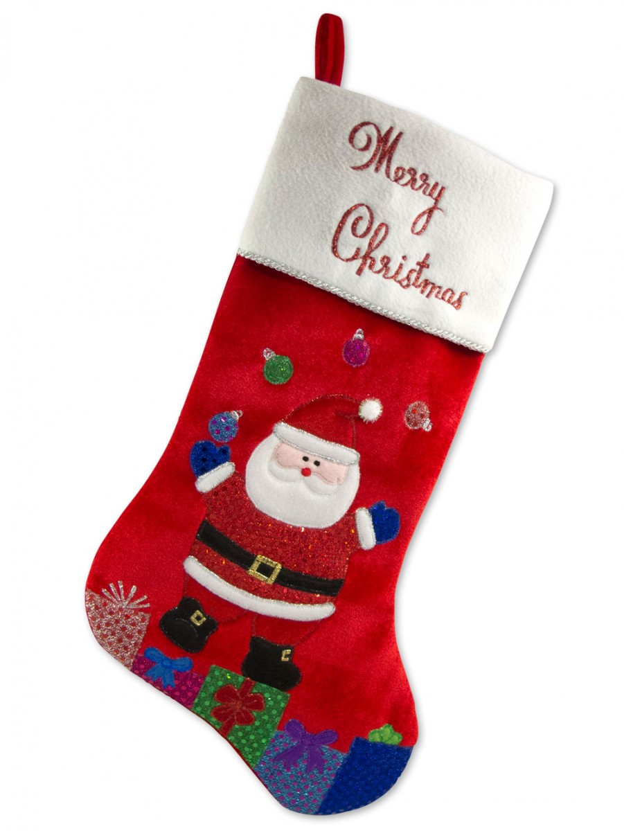 The stockings will be hung by the chimney with care when you use one of our felt stocking! One of the most enduring Christmas traditions, children have been leaving socks or shoes out for St Nicholas to fill for centuries. Hanging up stockings continues to be a cherished holiday tradition today. Continue it with your family with this red velvet stocking trimmed with white cuff feature embroidered “Merry Christmasâ€. The design features embroidered Santa Claus juggling baubles, while wrapped presents surround his feet. Metallic accents throughout. Includes a red velvet loop for easy hanging. Dimensions are 27 cm x 47 cm.