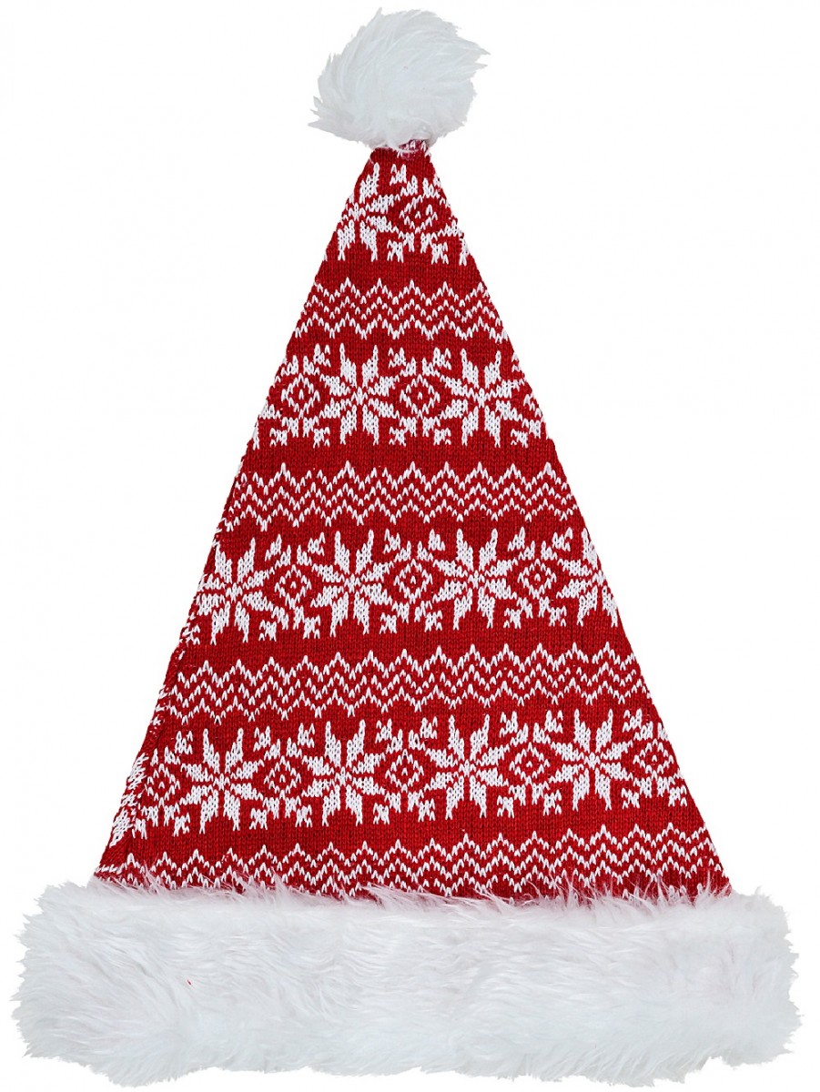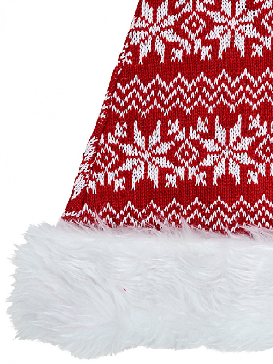 This thoughtfully crafted Santa hat exudes warmth and cheer with its red knitted sweater pattern, reminiscent of classic winter jumpers adorned with intricate white designs. The detailed patterns feature an enchanting combination of delicate snowflakes and playful jagged waves, evoking images of snowy landscapes and cosy winter evenings. Measuring 32cm x 42cm, this hat is generously sized to fit most heads comfortably, ensuring that it can be enjoyed by both adults and children alike.