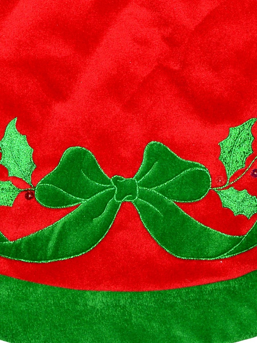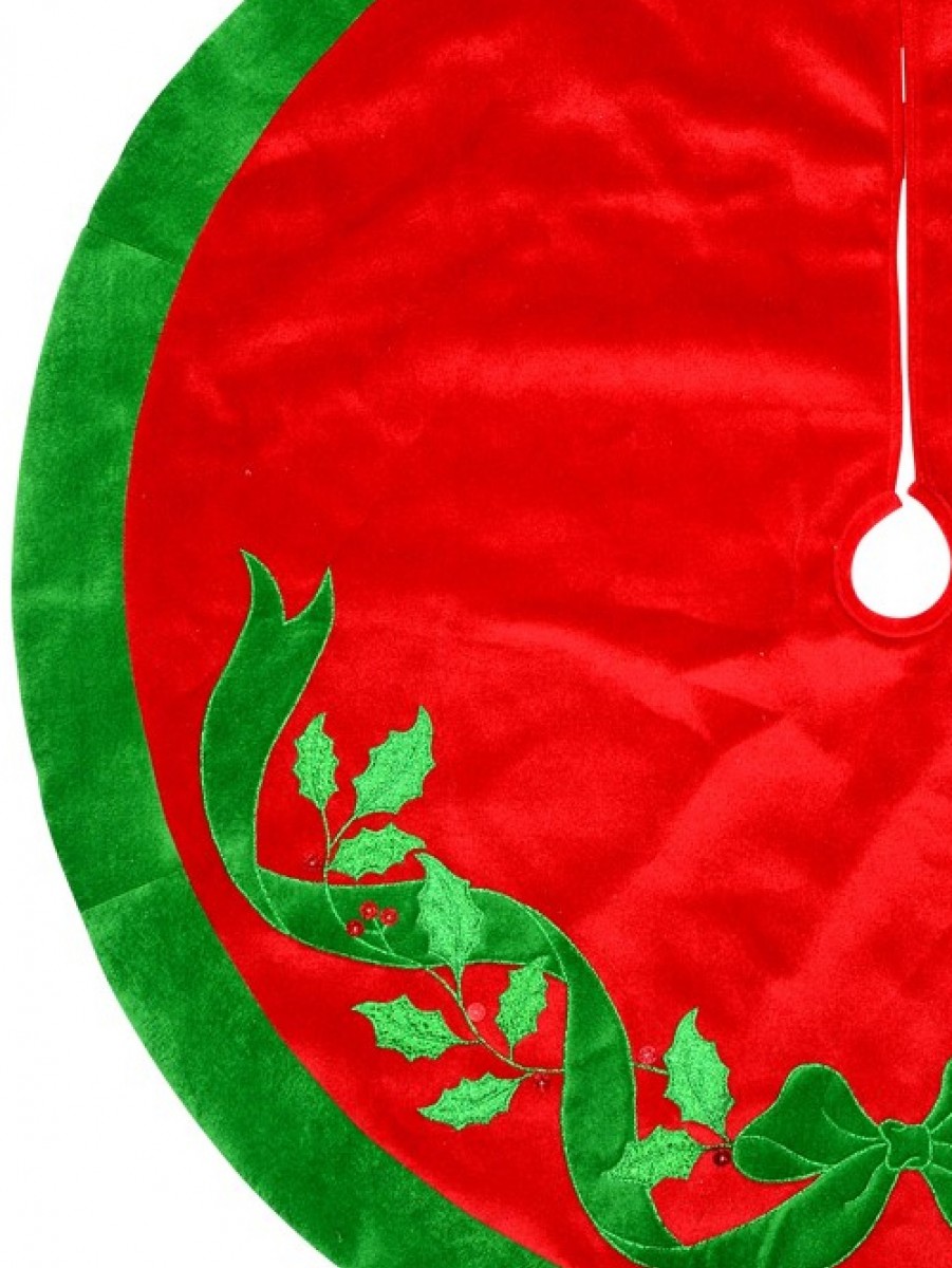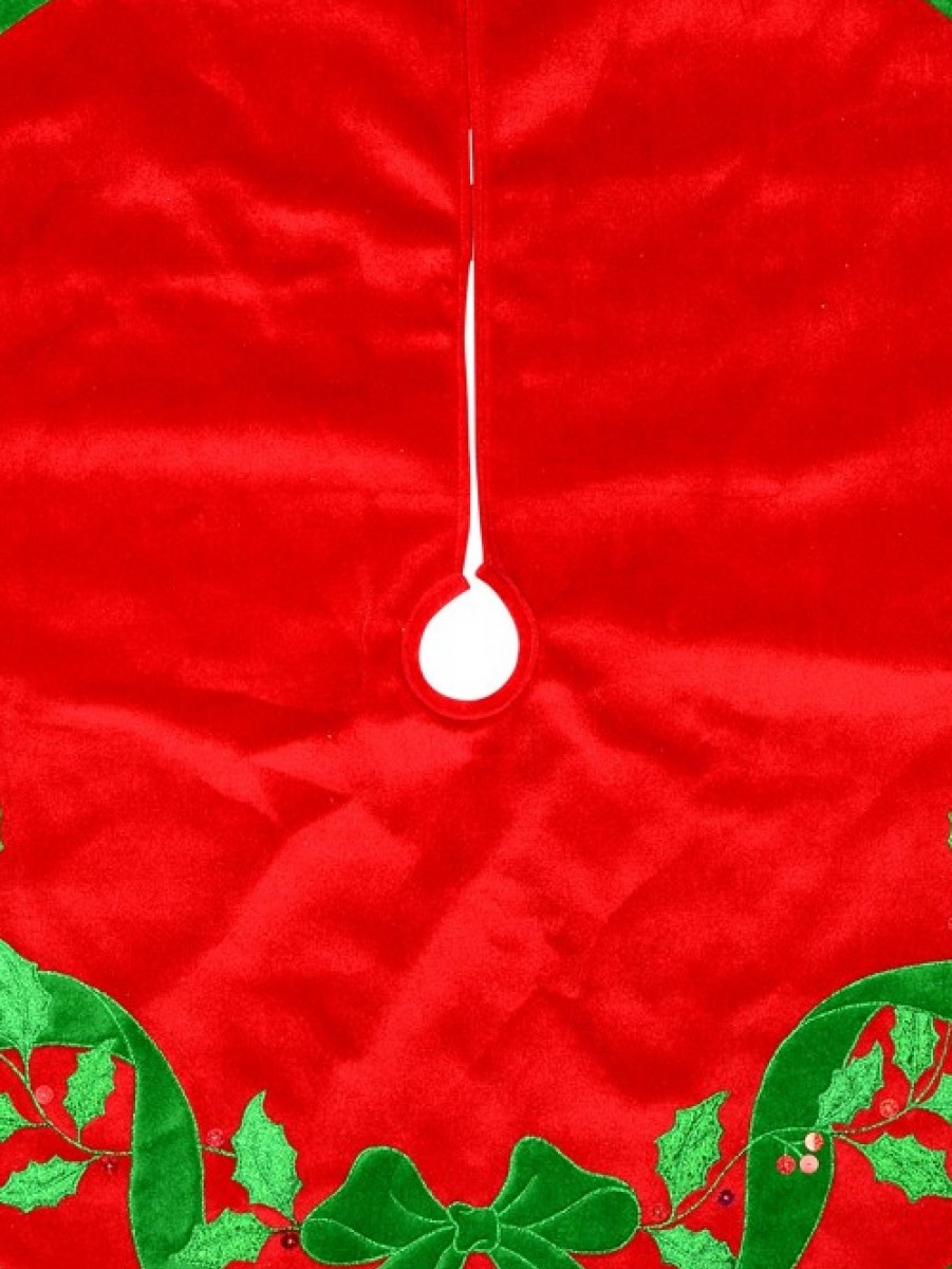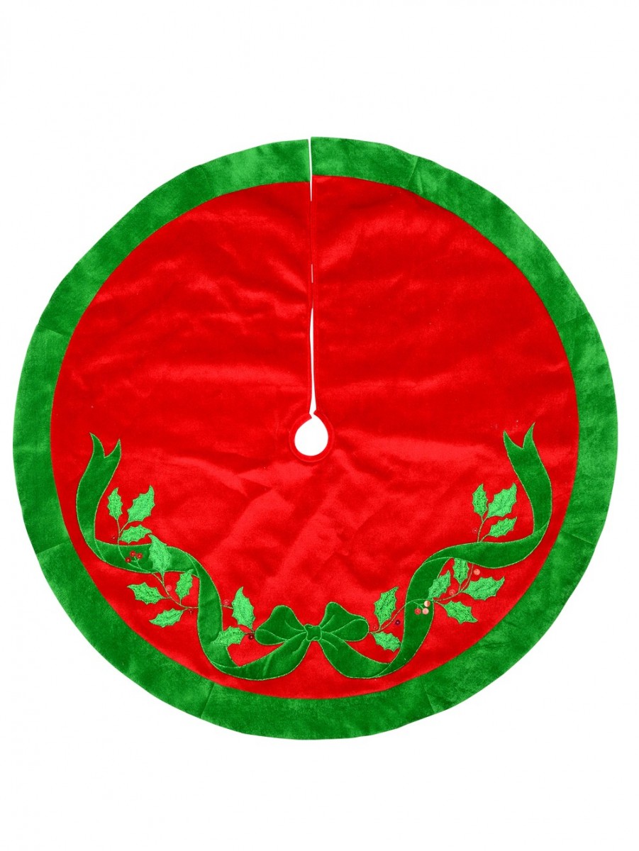 This red with green bow and mistletoe pattern velvet Christmas tree skirt is a perfect fit for your Christmas tree. These 1.2m x 1.2m Christmas Skirts include velcro tabs for securing your skirt in place. This product has the tratitional Christmas colours - red and green with a bow-shaped green velvet ribbon, embroidered with a metallic outline and holographic red berry stitchery. Buy Christmas tree skirt with full confidence and rest assured you will get the product you ordered.