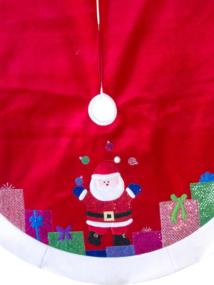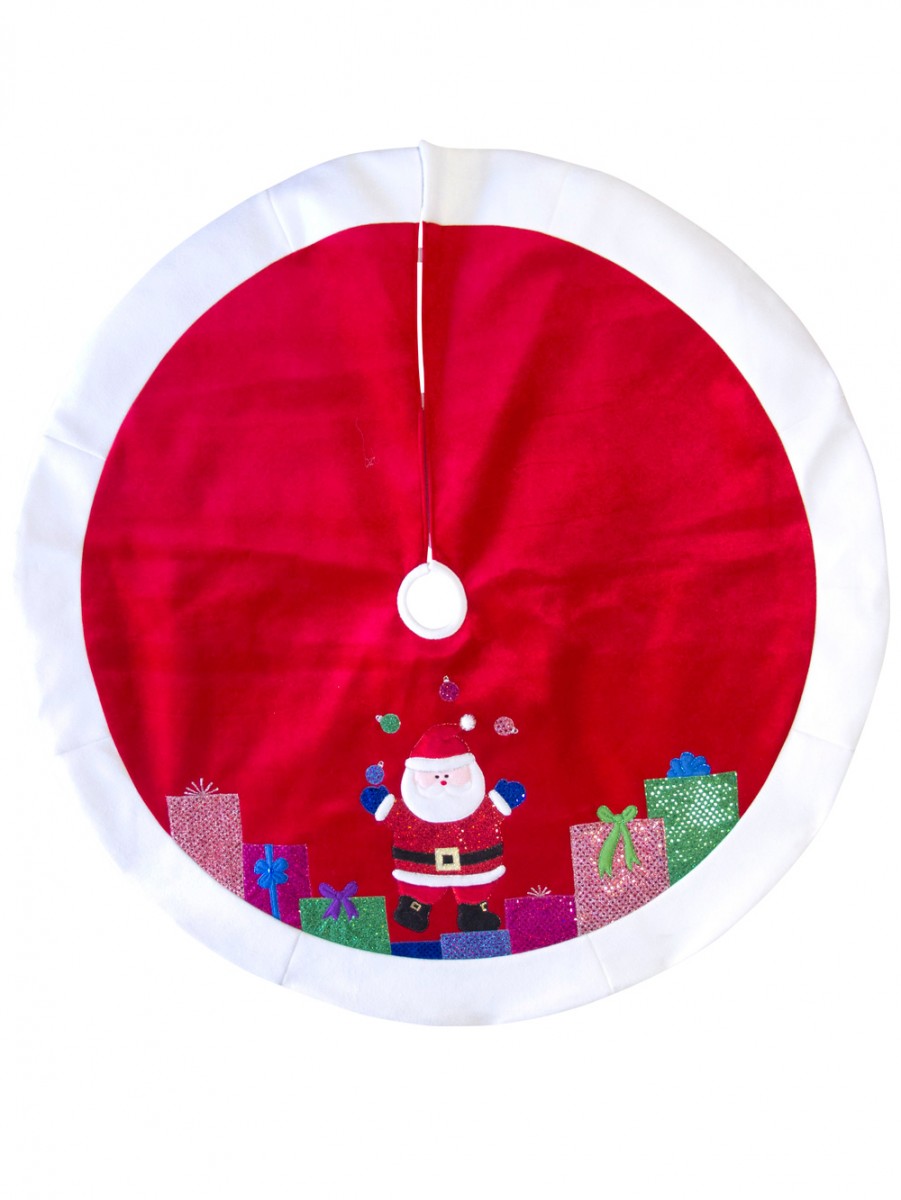 Some consider the Christmas tree skirt unnecessary and say it's a waste to put a piece of fabric right underneath where presents are going to block it. However, it's the ultimate finishing touch on the Christmas tree regardless of the type of look you're going for. This Red With White Trim juggling Santa Tree Skirt brings a touch of brightness and vibrancy to an area of the tree that's typically rather dark and boring when there's not yet any presents. The red velvet tree skirt has a white fleece border around the edge and a white fleece Santa hat pom pom. It depicts Santa juggling baubles surrounded by presents around his feet. You can't help but want this charming decorative item for your very own! Need more decor to complete your holiday tree? Christmas Warehouse has everything that you need and then some.