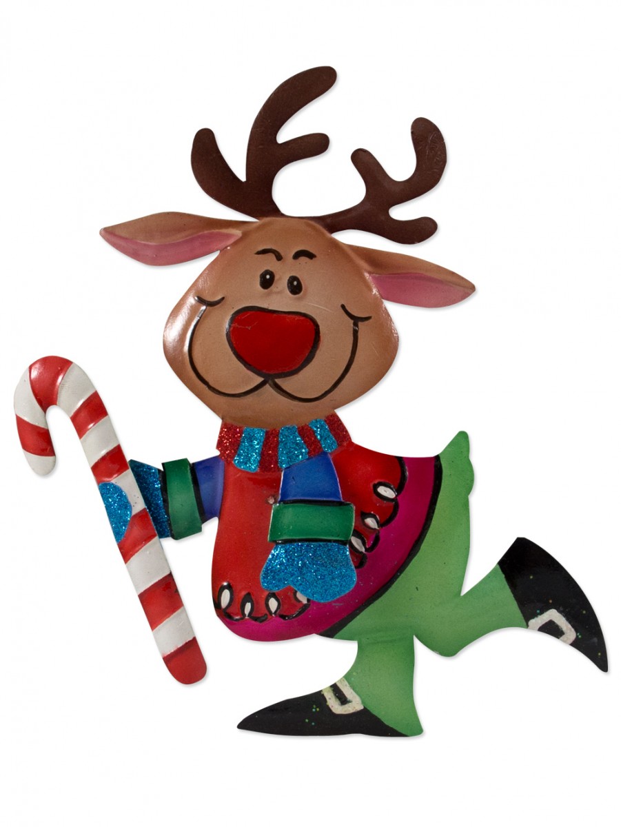 There's something about Santa's reindeer that just makes you smile. From a young age, we recited all their names and have learned about the important part they play in getting Santa around the world in just one night. This Reindeer Holding Candy Cane Tin Ornament is going to also play a big part in adding a big dose of charm to your Christmas tree. The ornament is of a reindeer wearing a red and blue sweater that has multi-colored detailing which he paired with green pants, blue gloves and black pointed shoes that have buckles on them. In his hand is a large red and white candy cane. He's sporting a huge smile and is clearly ready to get the Christmas season underway. At 12cm in height and 15cm wide, it will stand out on your tree without taking up too much space. It's a must have ornament that you won't regret having for your very own.