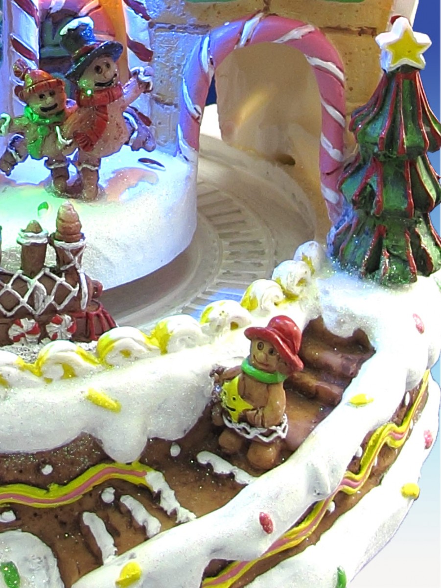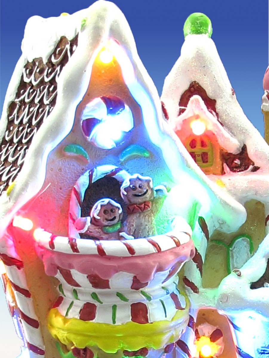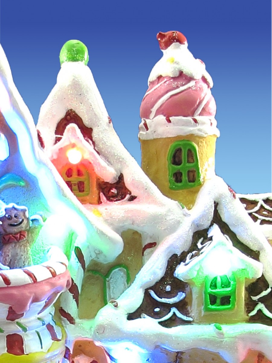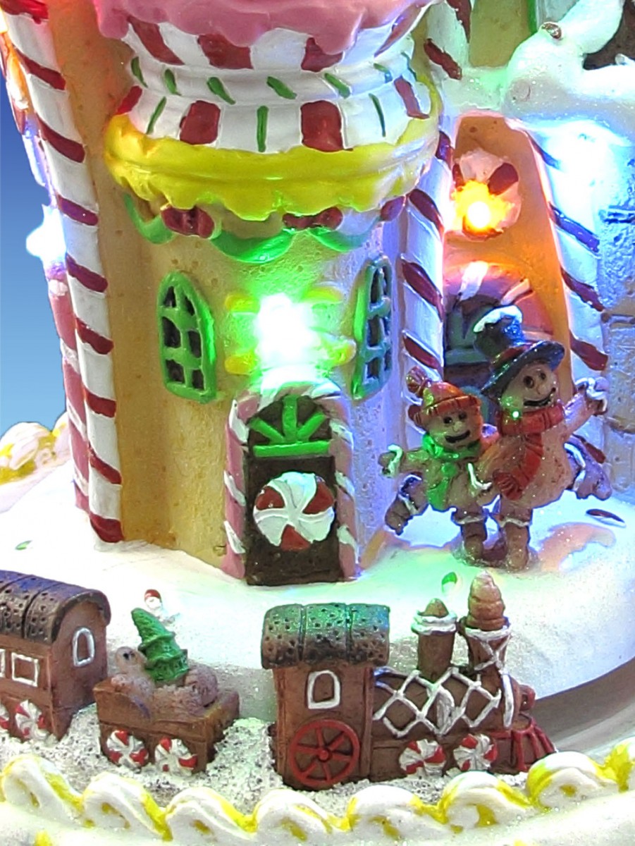 This year, you can take the gingerbread without the mess in this amazing gingerbread house figurine. The house measures 19 cm long x 24cm high x 18cm wide. It can be set up with other village figurines, or stand alone on a shelf, end table or ledge. The figurine is made entirely of resin, with a careful and intricate paint job. Bright coloured frosting accents drip from the awnings of the house while a gingerbread family clad in red and green winter wear dance outside. It is an entire scene of Christmas joy in miniature form. Aside from the charm of the design, perhaps the most exciting aspect of this gingerbread house is the special effects. Different, brightly coloured LED lights shine above each window of the house, enhancing the effect of joy and whimsy. Additionally, an animated miniature train travels round and round the house when you plug the figurine in. This gingerbread house scene is one you could dream up in your wildest imagination. Spend a few minutes watching it, and see how quickly you will find yourself entranced by the miniature world with a happy gingerbread family and an animated train. This charming little house is sure to delight all of your guests, from the young to the old, to the young at heart.