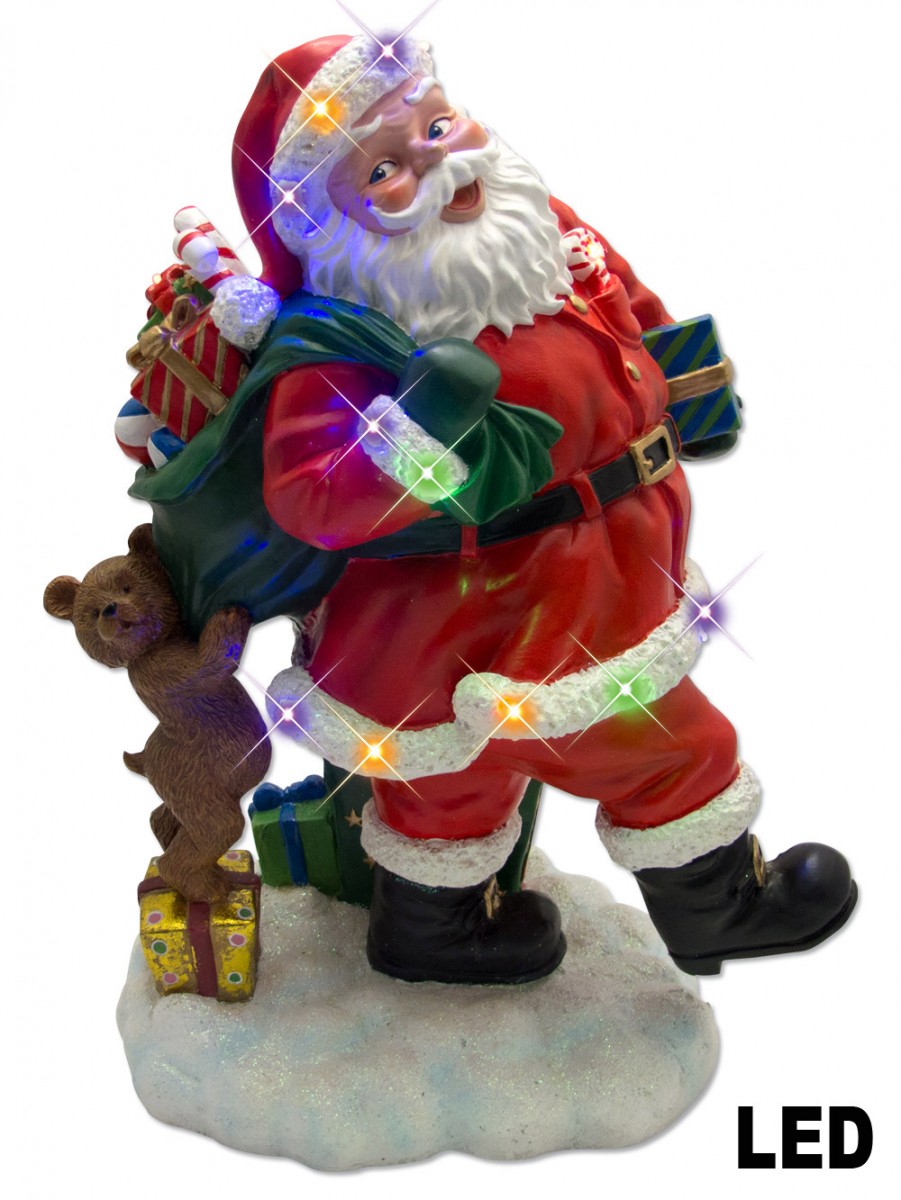 The image of Santa has been used in relation to Christmas for years, yet it still never fails to make many smile and feel happy. This Resin Santa With Bear and Gift Bag LED Illuminated Ornament is sure to do just that. It depicts Santa, clad in his usual red and white trimmed suit and hat, strutting through the snow with an overflowing bag full of toys for good boys and girls. Just one problem ? a cute little teddy bear is trying to hitch a ride! Thanks to multi-colored LED lights along the trim of his coat, sleeves and hat, Santa is sporting a little extra sparkle. Standing at 285mm, this little ornament is vibrant enough to stand out without taking up too much space on your tree. As it stands flat, you can also use it as a small piece of Christmas décor in any spot that needs a little bit of holiday cheer. You can't beat a double duty decoration!