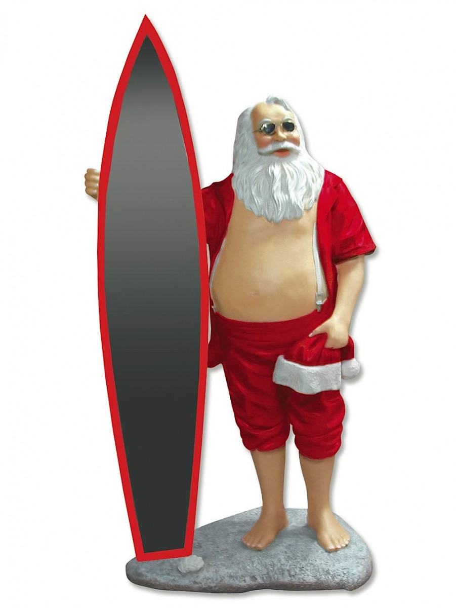 Now here's a novel idea for your home, business or shop - a surfing Santa! Many Christmas decorations and foods reflect a European climate and culture, and in our warm Australian weather at Christmas time this Santa would be quite at home on display, especially since he is sporting a pair of sunglasses and has removed his hat in the heat.