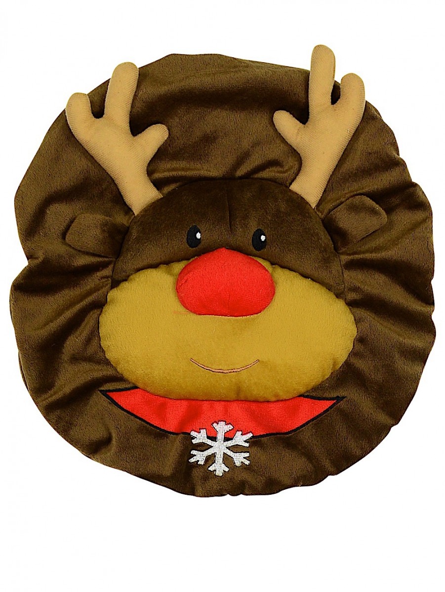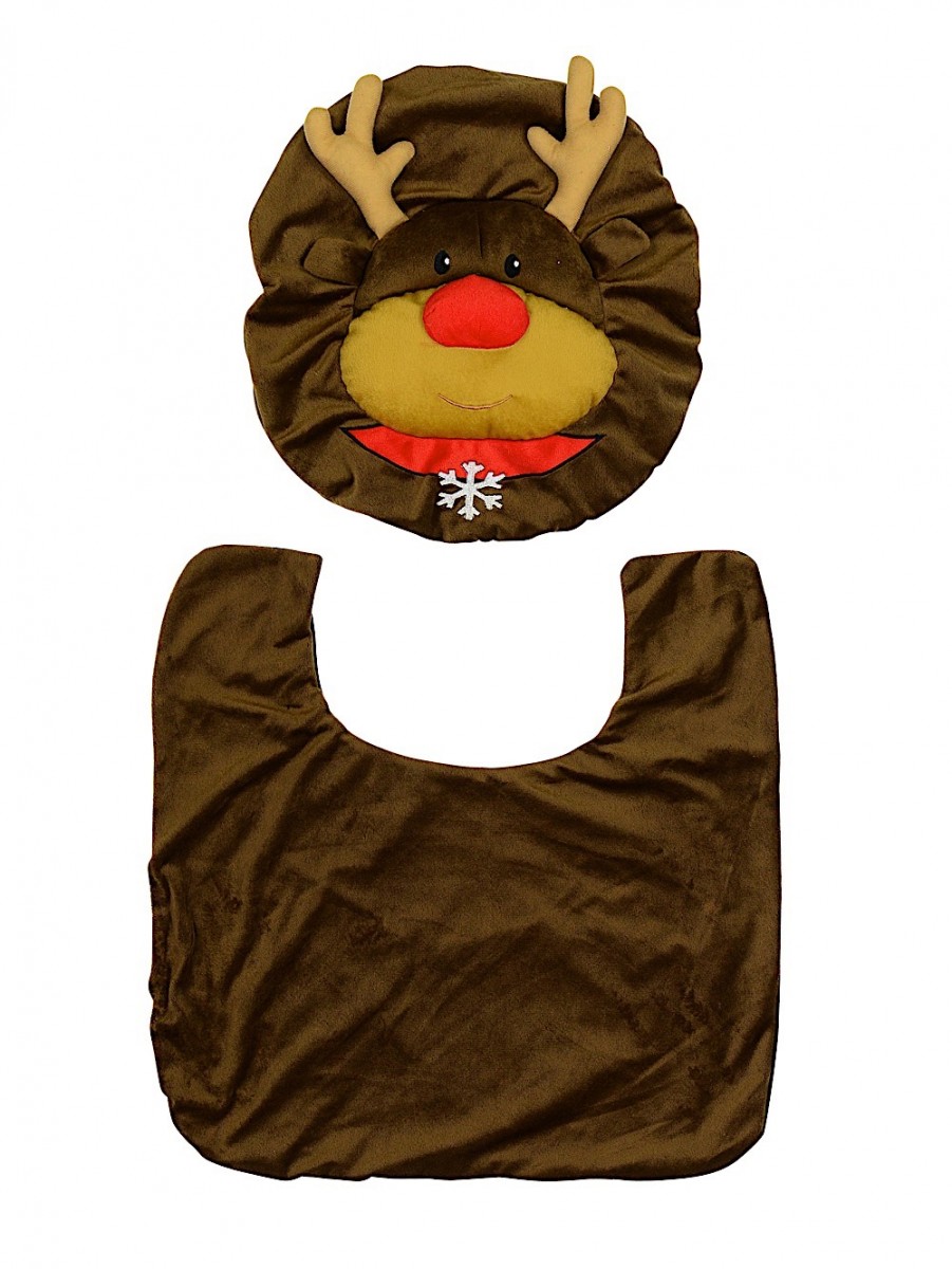 Delight your children by bringing Rudolph to the throne room in your home! This 2 piece set is sure to add some laughs this Christmas! Toilet seat cover is plush brown with Rudolph's cute face, red nose, antlers and white snowflake on his collar. Floor mat is plain plush brown