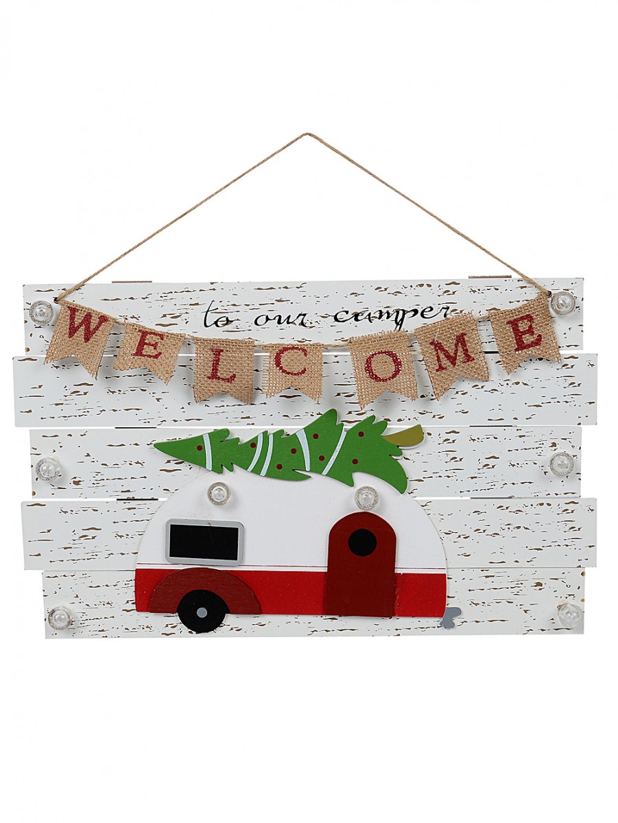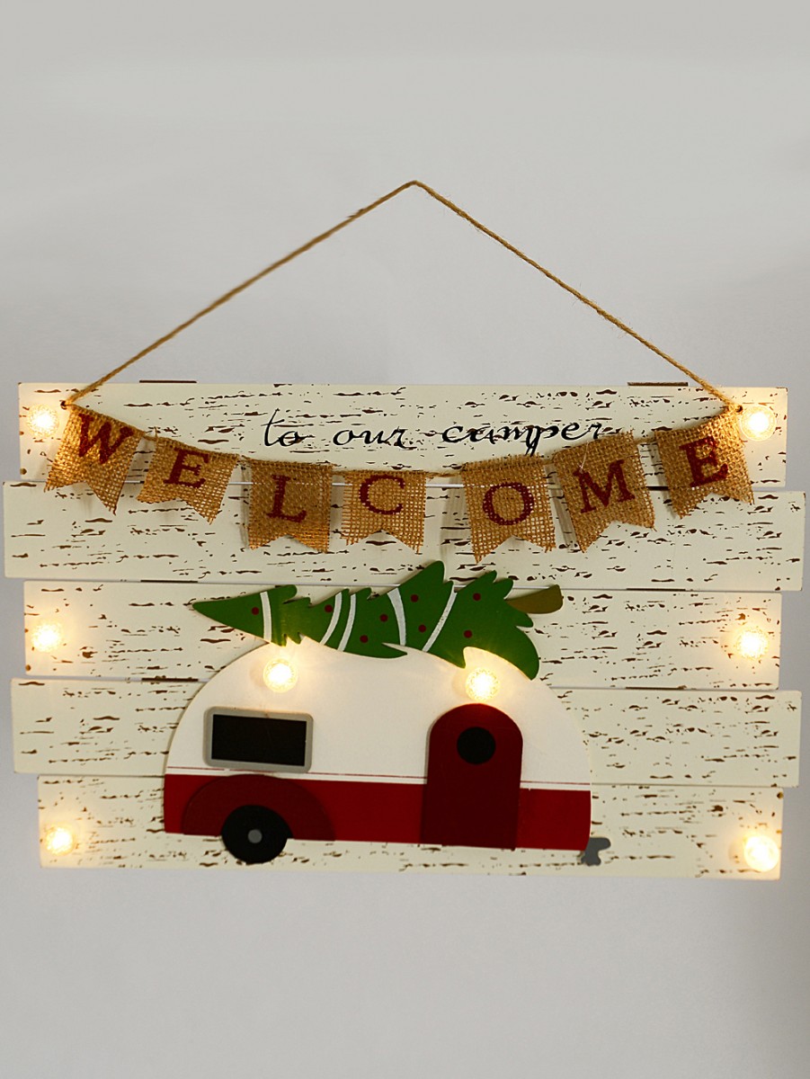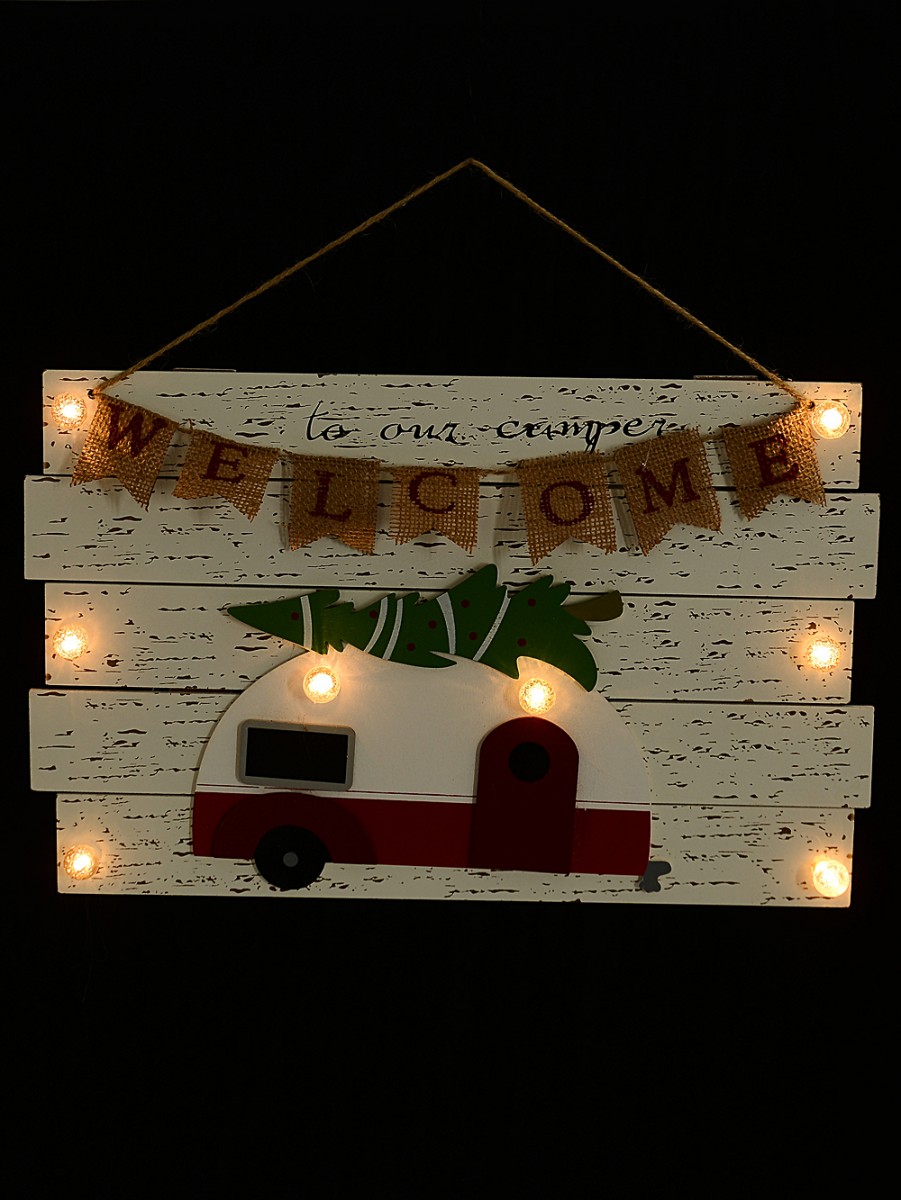 The Rustic Welcome To Our Camper With Illumination Christmas Plaque is a celebratory decorative wooden sign which would add a touch of rustic Christmas enchantment to your decorations this Xmas. It would be perfect for hanging in entrances to offices and also entrances to homes. It is decorated with a Christmas motif showcasing camper cut out and a welcoming greeting with battery-powered warm white illumination.