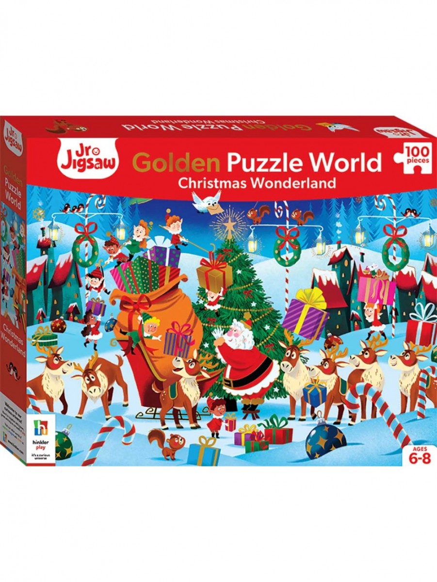 It's Christmas Eve in the North Pole and Santa, the elves and reindeer are working together to pack his sleigh with presents! With sparkly gold foil details, Junior Jigsaw Golden Puzzle World: Christmas Wonderland is so festive and fun to put together. Don't forget to look for the mischievous mouse hiding somewhere in the image.