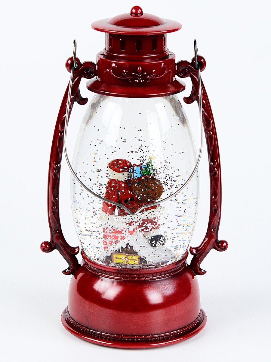 Enhancing its captivating design, this lantern includes battery-operated illumination and a mesmerizing snowstorm swirling glitter animation. When switched on, an internal fan stirs silver glitter, creating a continuous snowfall effect illuminated by a white LED light. This magical combination transforms any ordinary mantle, dining table, or display scene into a wintry wonderland, evoking the spirit of Christmas.