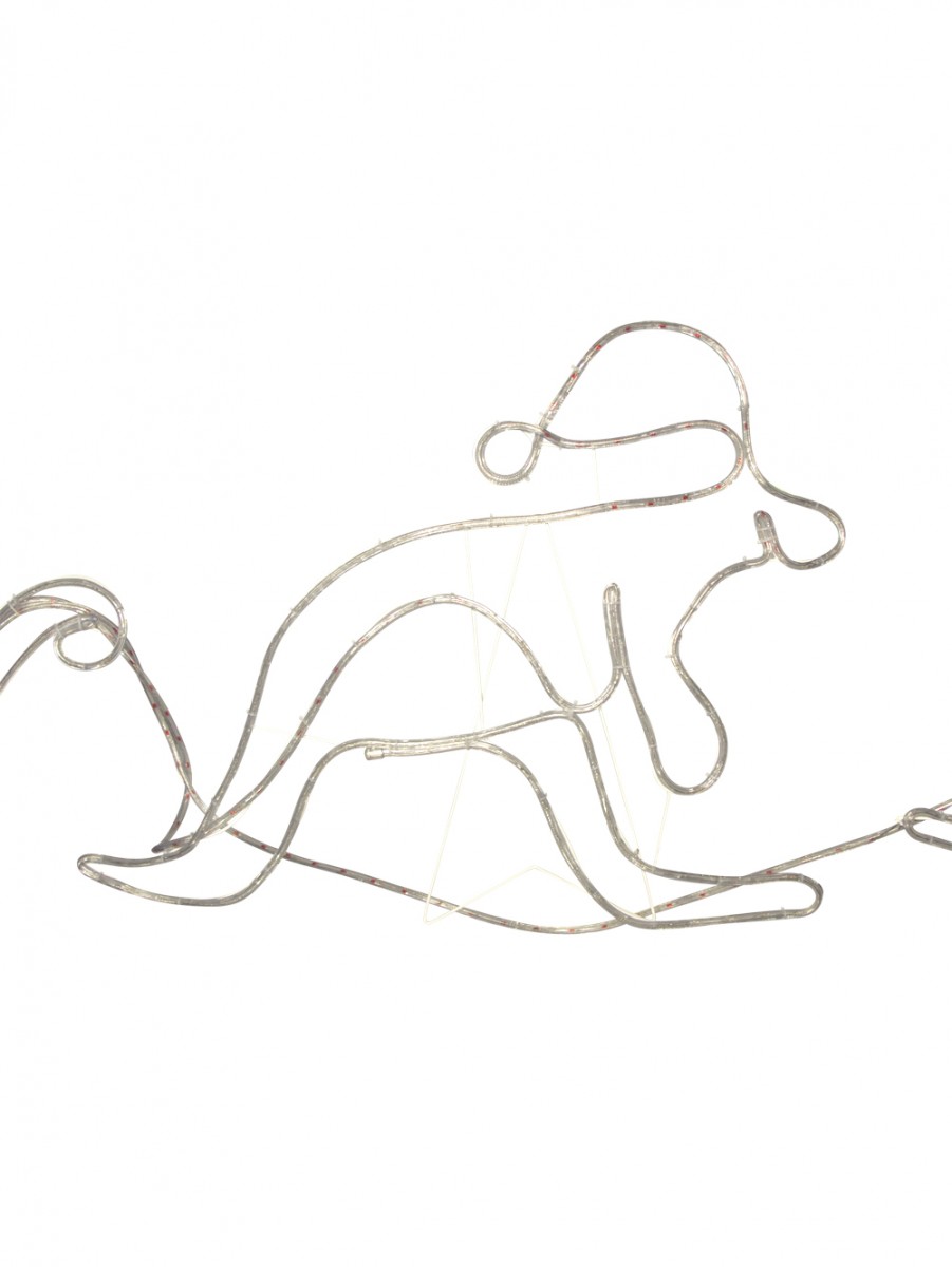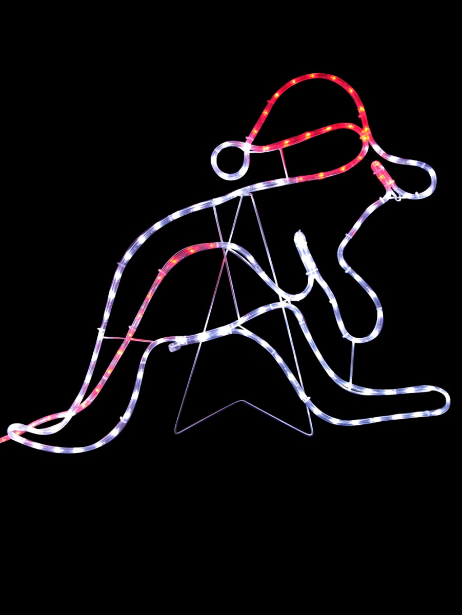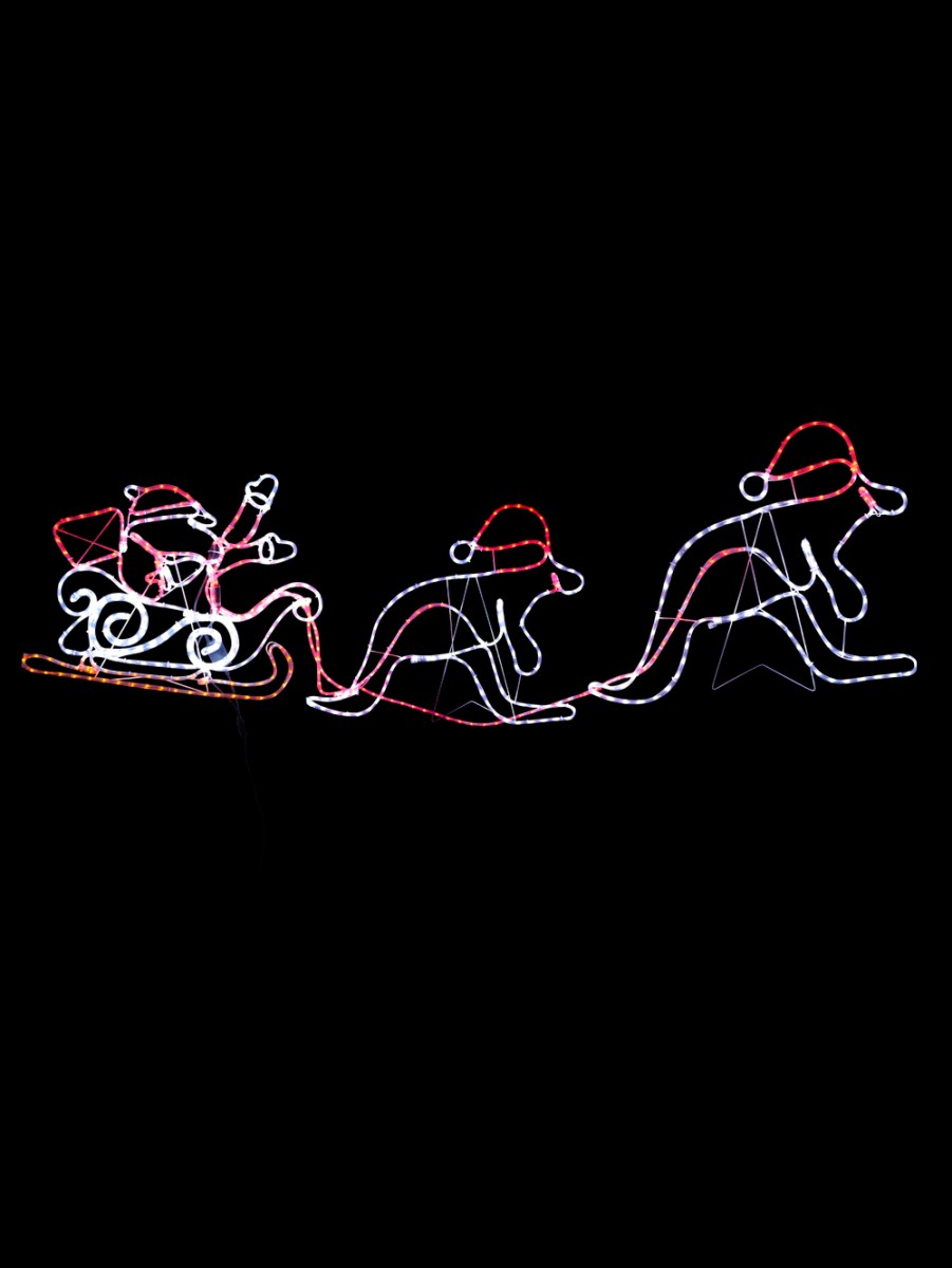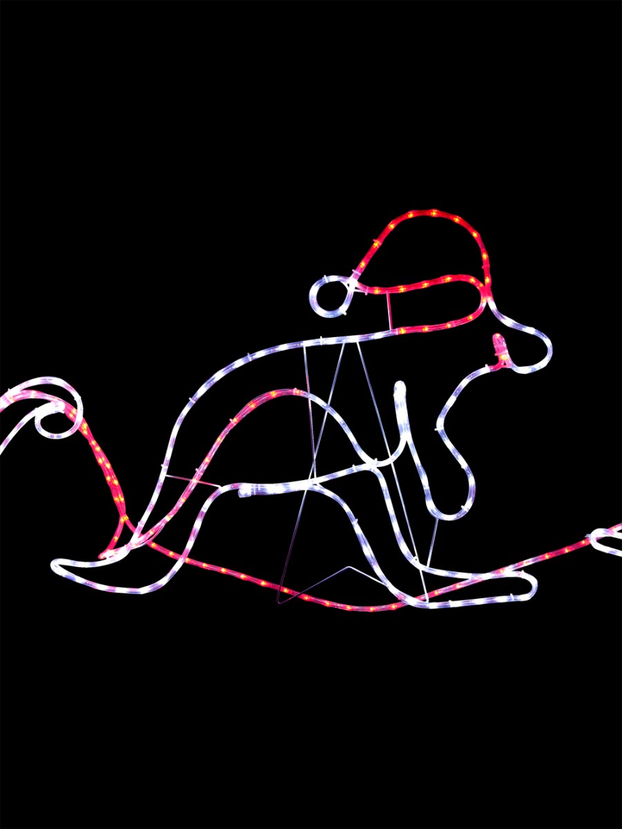 Celebrate Christmas this year in true Australian style with this light up Santa Claus cavorting with kangaroos in a light rope display! Red, cool white, and orange LED lights in a clear rope tube immortalise Santa and two boomer kangaroos together. Lights feature multi speed flashing functions, including static mode. Suitable for indoor or outdoor use. As all our items ship worldwide, this lighting display would be a wonderful gift for expats in your life to show off their Australian pride during the holidays. Measures 2.9 m x 70 cm and includes 3 m of lead wire. Mains operated. This product complies with all Australian safety and performance requirements.