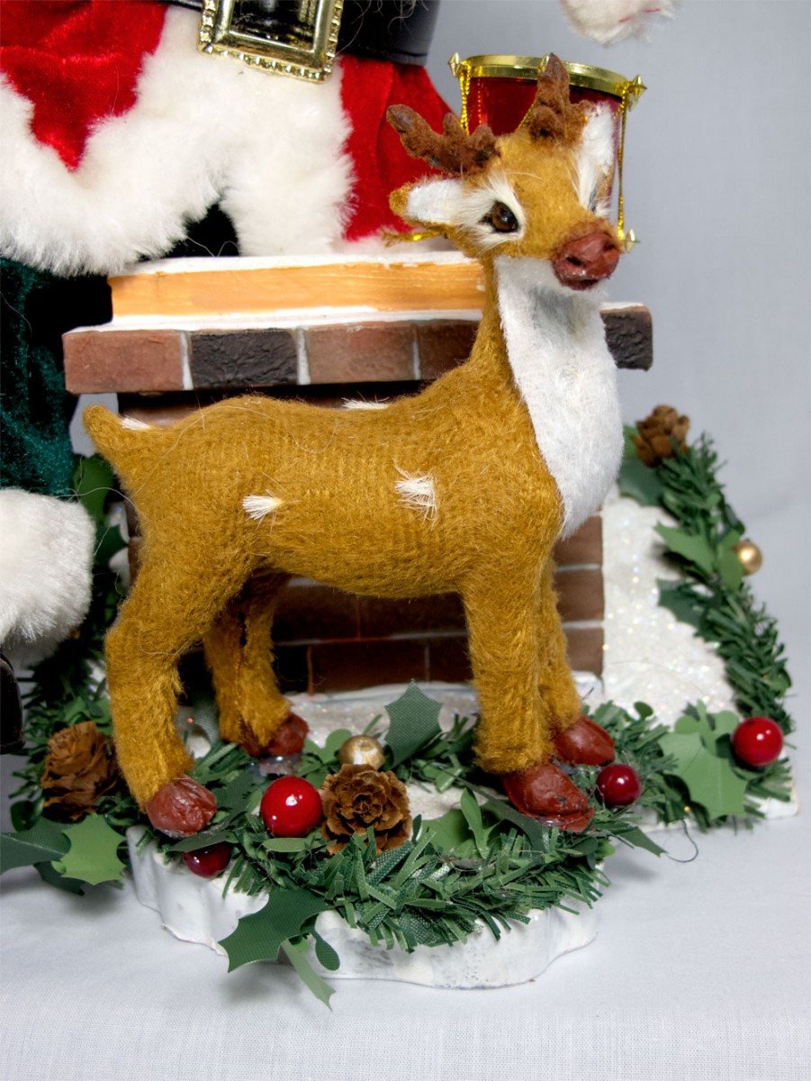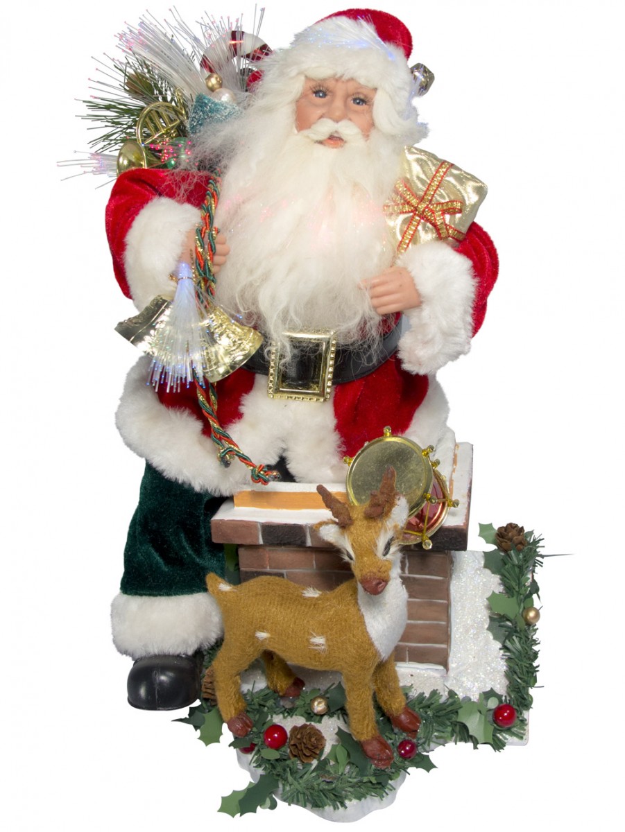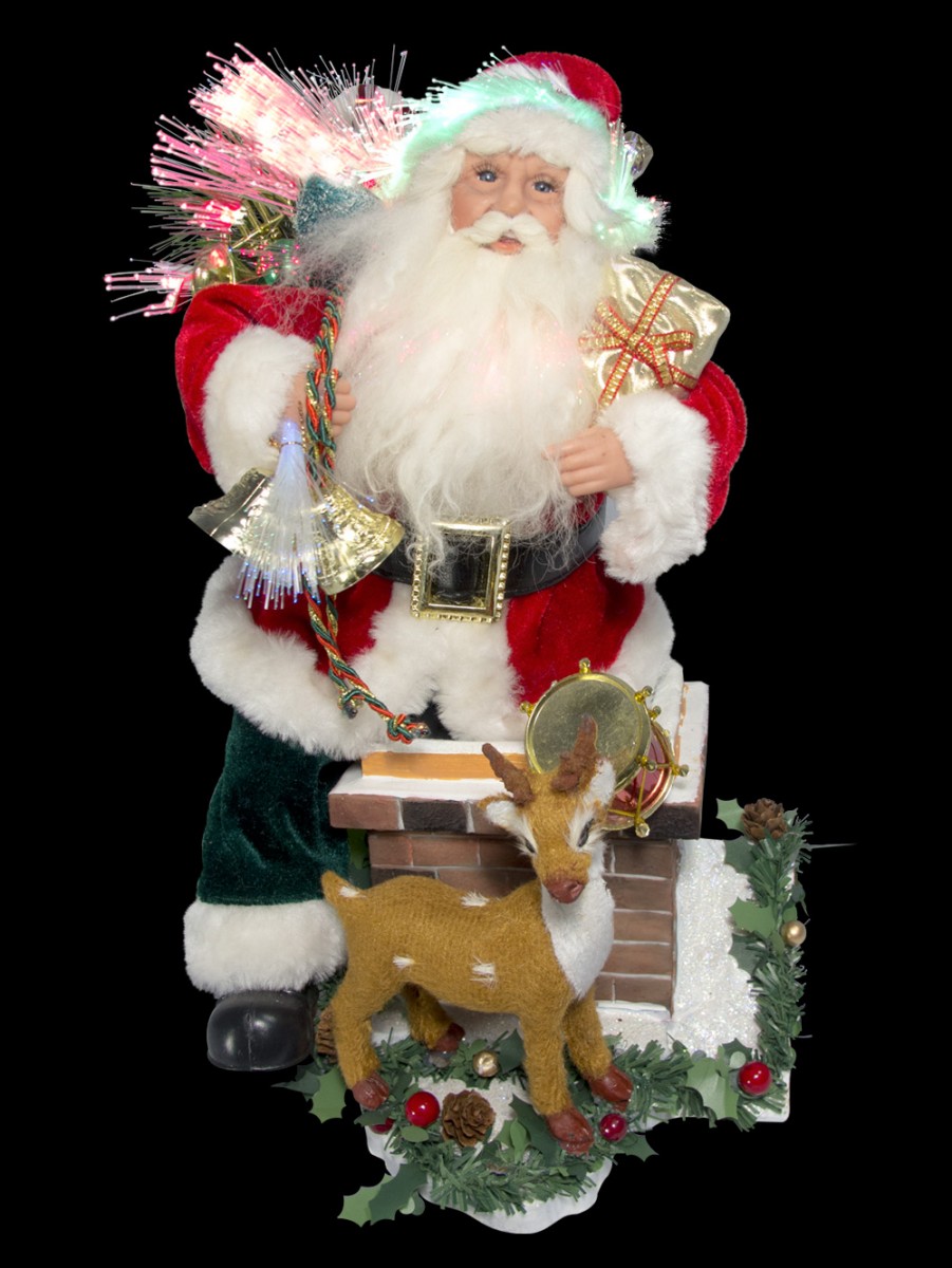 Wow! This beautiful Santa figure is not only animated, it's musical as well! Anyone who loves to collect Santa figures will surely appreciate this one. Our Santa on Chimney with Deer stands almost 3 feet in height, and comes to you complete with all his toy, goodies, reindeer, and decorations so you can use him as the focal point in your holiday centerpiece, or set him on the hearth and watch your guests enjoy the display! Santa wears forest green velvet trousers and a ruby red velvet coat and hat all trimmed in white faux fur. Black boots and a wide black belt with a brass look buckle complete his outfit. He?s carrying a sack of toys and goodies, and a foil wrapped present with a ribbon and bow. His reindeer stands at the ready as Santa begins his descent into the chimney, all surrounded by snow and a bed of greens and holly.