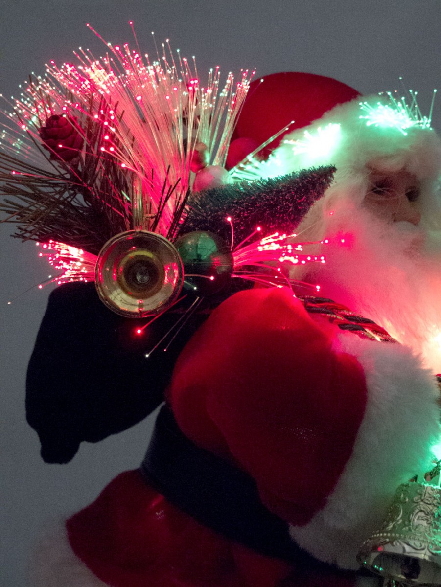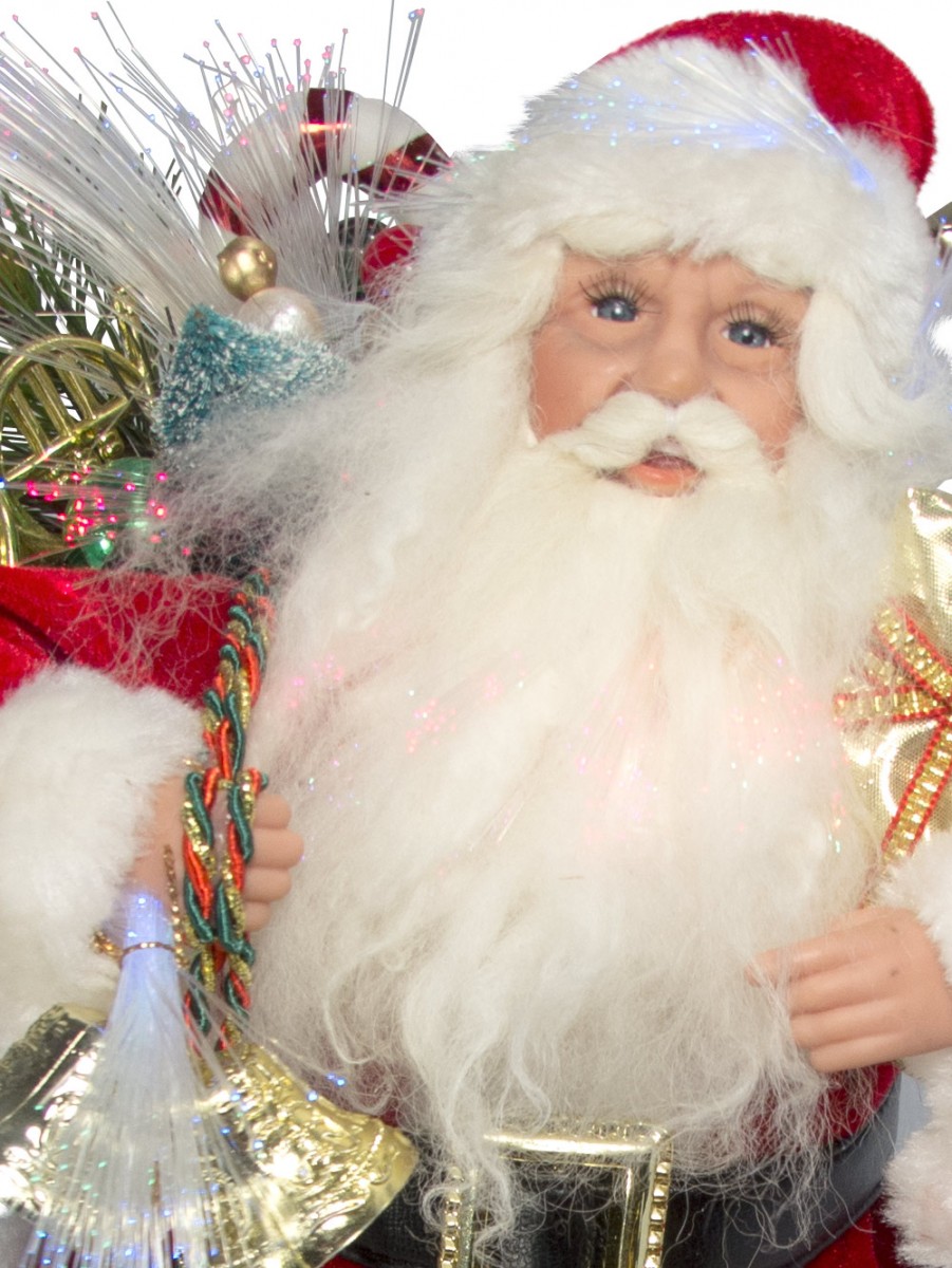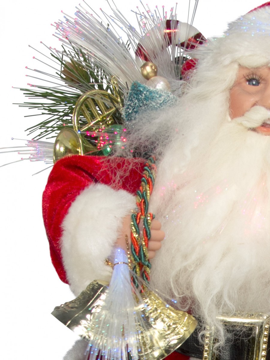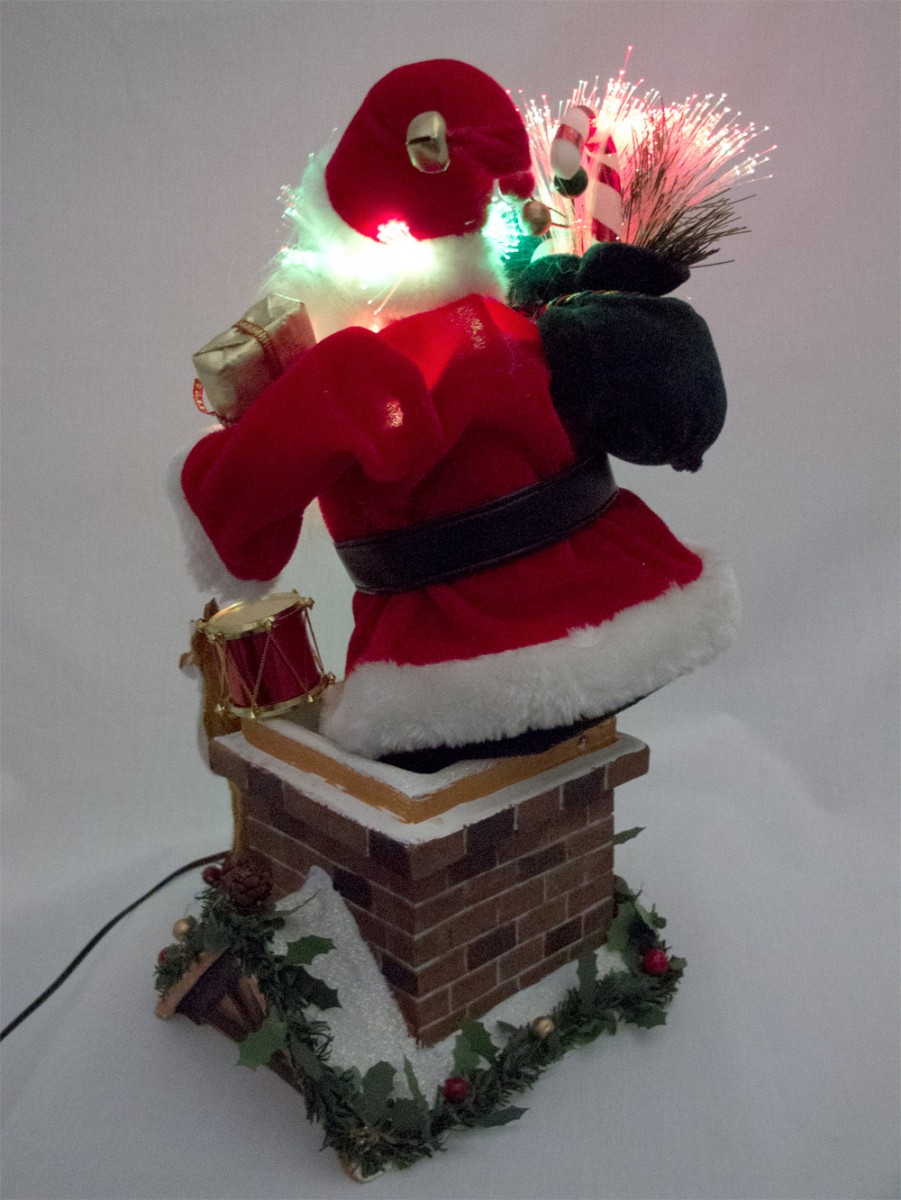 Wow! This beautiful Santa figure is not only animated, it's musical as well! Anyone who loves to collect Santa figures will surely appreciate this one. Our Santa on Chimney with Deer stands almost 3 feet in height, and comes to you complete with all his toy, goodies, reindeer, and decorations so you can use him as the focal point in your holiday centerpiece, or set him on the hearth and watch your guests enjoy the display! Santa wears forest green velvet trousers and a ruby red velvet coat and hat all trimmed in white faux fur. Black boots and a wide black belt with a brass look buckle complete his outfit. He?s carrying a sack of toys and goodies, and a foil wrapped present with a ribbon and bow. His reindeer stands at the ready as Santa begins his descent into the chimney, all surrounded by snow and a bed of greens and holly.