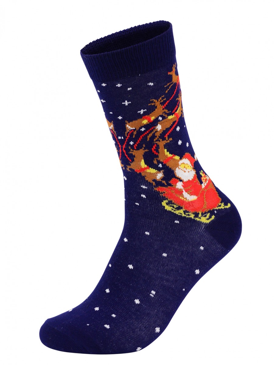 The Santa & Reindeers Christmas Socks which is sold in pairs features a blue socks with the traditional colourful image of Santa Claus riding his famous reindeer driven sled. Santa is clothed in his usual red cloak with white trims and dons a similarly coloured Christmas hat while wearing red gloves. He is pictured smiling cheerfully as he rides among the stars while white dots create the image of bright shining stars on a deep-blue moonless sky.