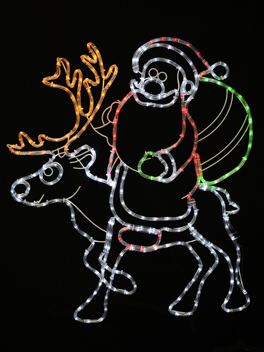 This rope light silhouette features Santa with a bag full of presents riding his golden horned reindeer straight to your home. There are white, red, green and orange LED rope lights on the white metal frame and there is a multi-function controller where you can choose from 8 special effects including still mode to get the perfect lighting depending on your mood or venue.