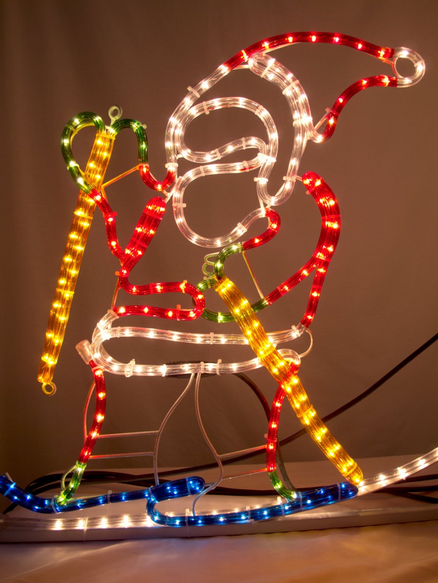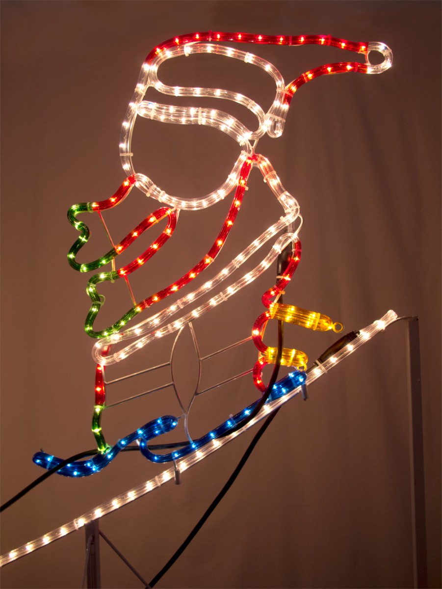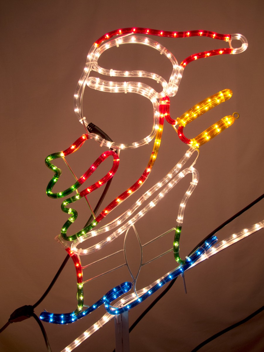 LED lights are safely enclosed in durable weather proof tubing or "rope", and are done in red, white, blue, and yellow. Can be used indoors or outdoors. All standing hardware is included. Hang a string of our stars or star chains over him, or display one of our Merry Christmas lighted banners to bear your holiday greeting.