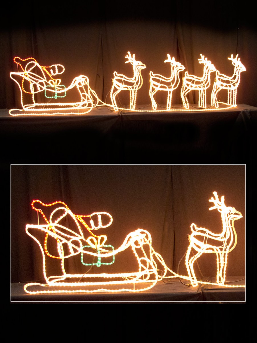 Measuring 2.4 metres x 705mm x 430mm, with a 1.5 metre lead, this gorgeous display of four elegant lighted reindeer guiding Santa and his sleigh is three-dimensional, and is covered with beautiful incandescent lights. The prancing reindeer and sleek sleigh are illuminated with white lights, while the Santa figure stands out with beautifully coloured lights. This magnificent depiction of a wonderful Christmas story will prove to be a stunning addition to any lawn, garden or courtyard Christmas decorations, not to mention a community attraction throughout the holiday season.