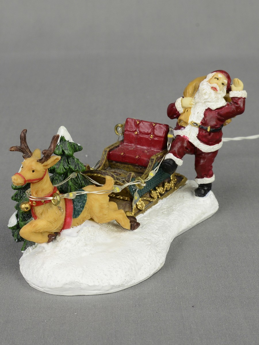 This beautiful Santa, sleigh and reindeer figurine is sure to bring some added flair this Christmas season and will be the perfect adornment all winter long. Made of resin, it has reins that are illuminated with warm white LED lights and can be added to your business/home assortment or as a gift for those who matter the most!