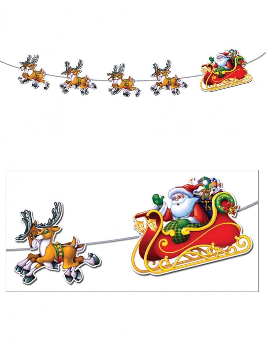 Bring the yuletide cheers anywhere with large and huge die-cuts especially themed for Christmas decorationsating! This large Santa, Sleight & Reindeer is the easiest way to accentuate venues and prep up for the holidays. This yuletide accessory and cut out perfectly blends with other Christmas trimmings. It is easy to hang and decorate in homes, workplaces and other venues. Hang it to accentuate walls, corners and nooks indoors and outdoors. The colourful and jovial die-cut is crafted from resilient and high quality combination of materials. It is 2.4 metres in size or dimension so that decorating is never limited at all! The yuletide accessory is double sided. Hence, it could also be used as banners or hanging streamer. The colourful pictures of Santa in a sleigh and his reindeer's are printed on card. The cards are linked with a thin yet durable cord from Santa to his reindeer's.