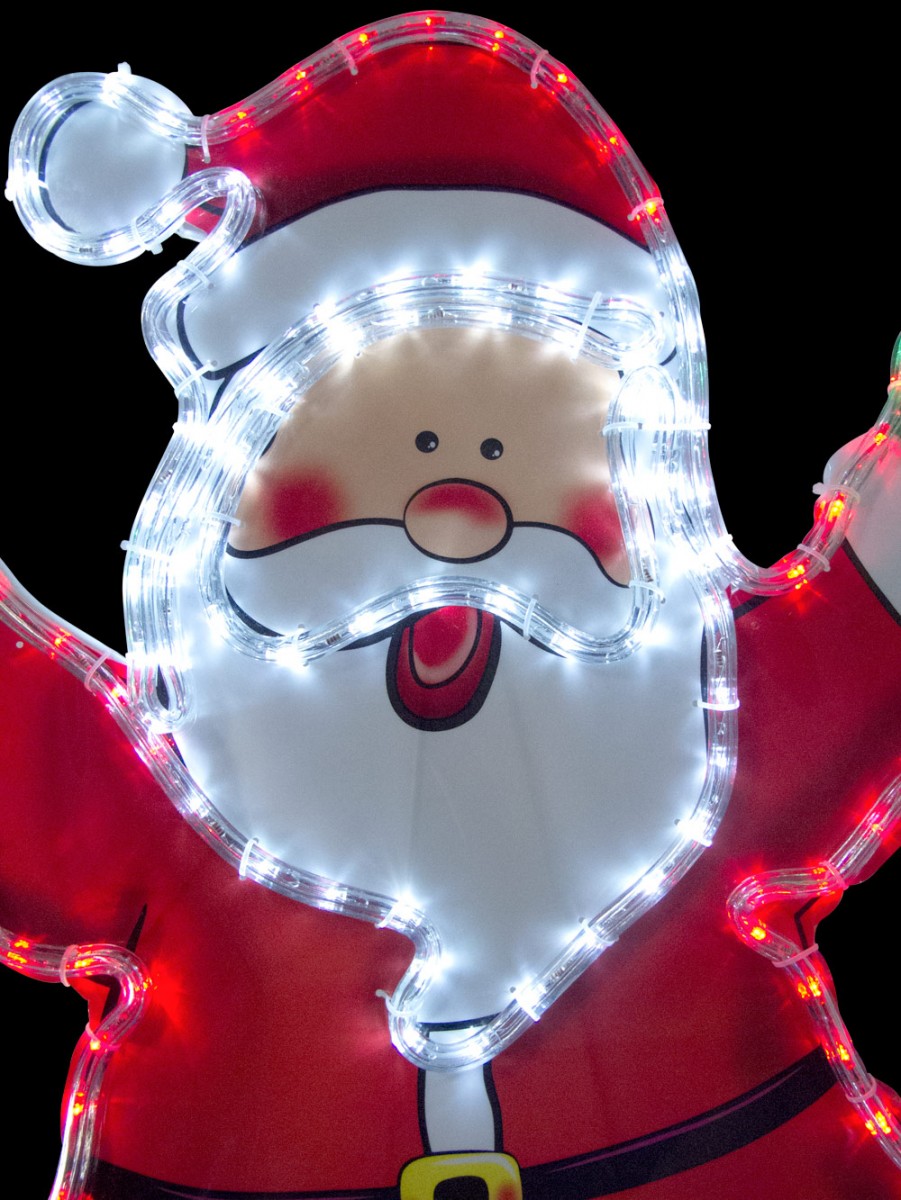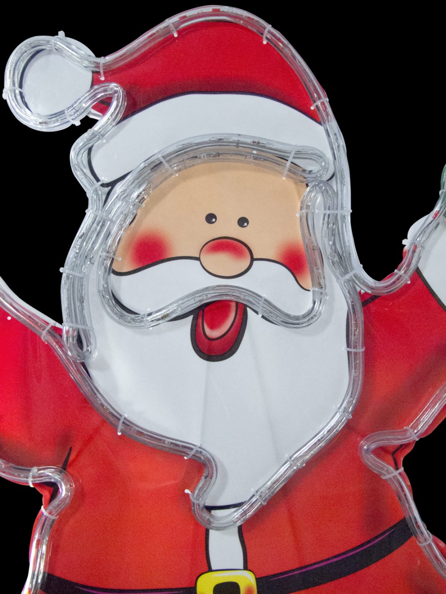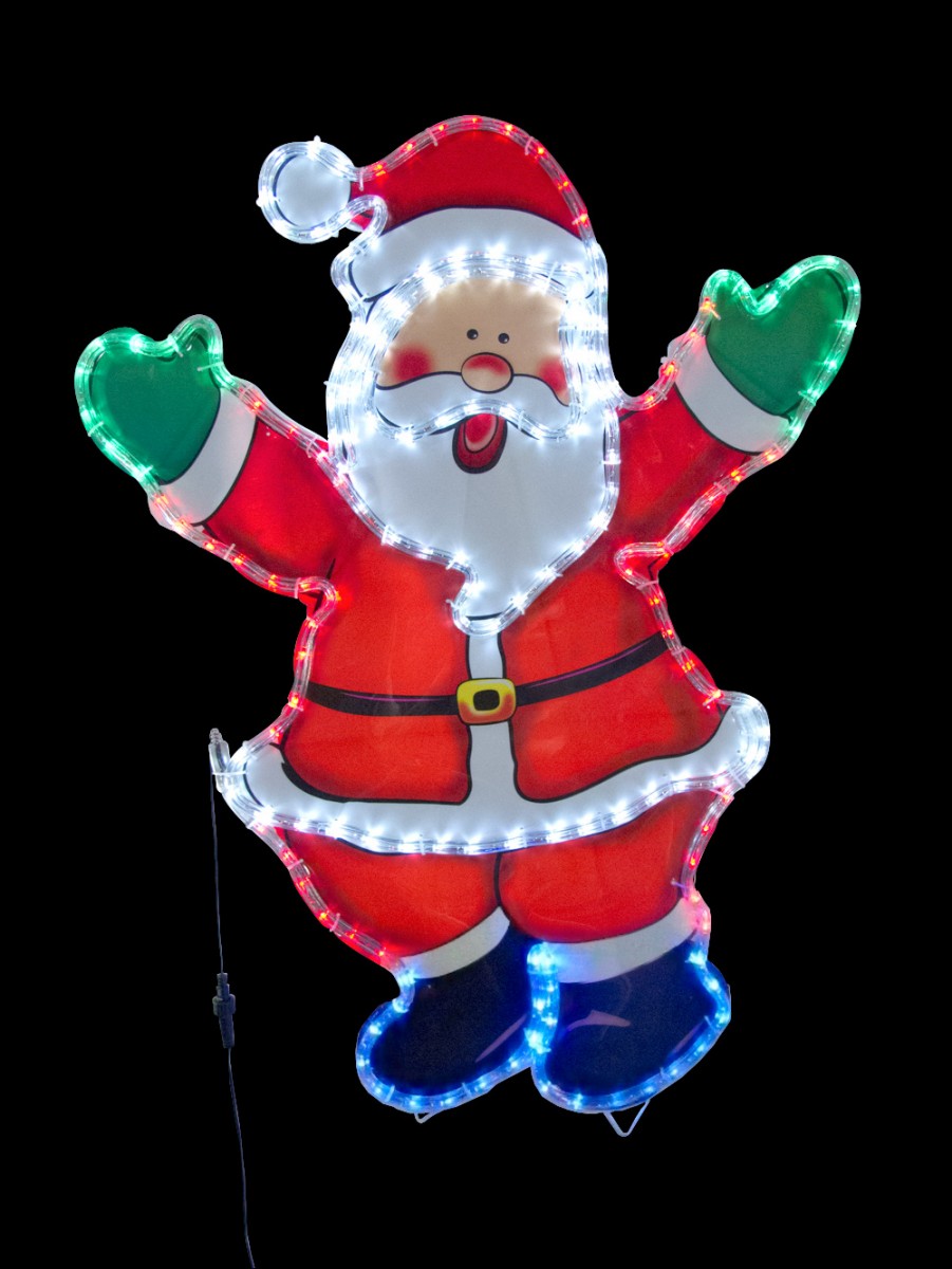 Rope lights are one of the most widespread types of ornamentation used for decorating during the holiday season. They're safe and last for years without the need to replace bulbs, and our Santa with LED Rope Lights fits right into this popular form of illuminating your home. He stands more than 2 1/2 feet high and wears his iconic red suit and hat with white fur trim. A black belt and gold buckle, blue boots, and green mittens complete his ensemble. His arms are outstretched in a holiday welcome.