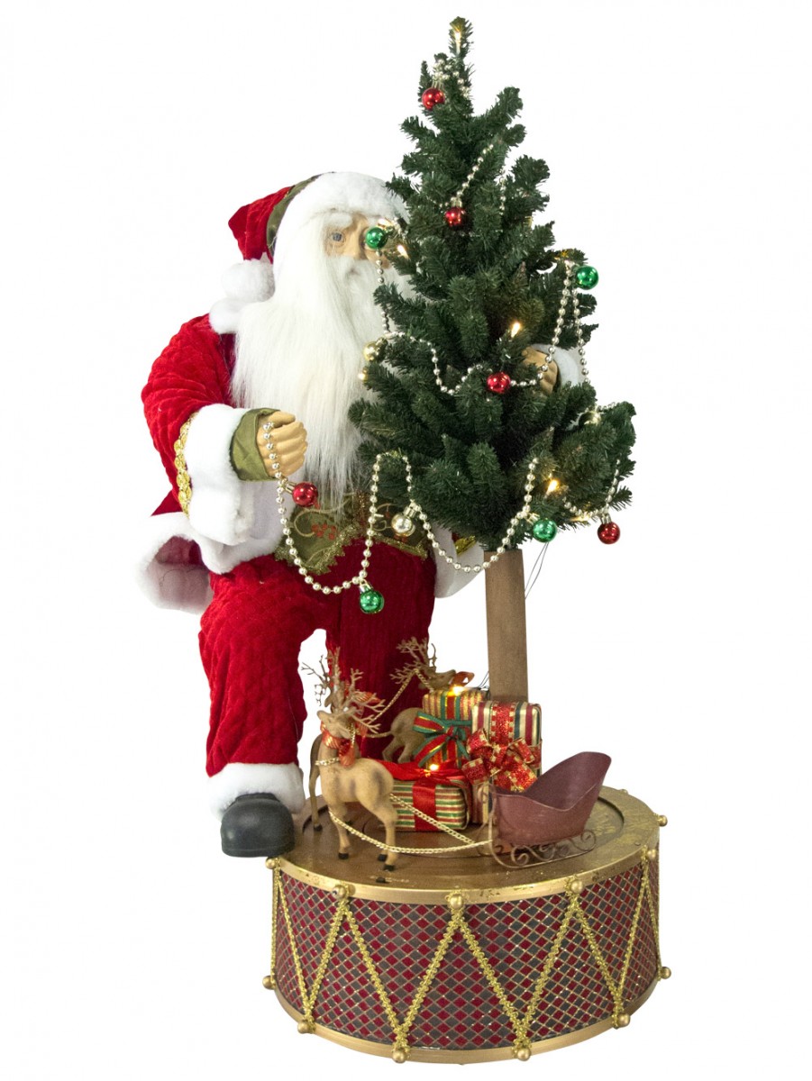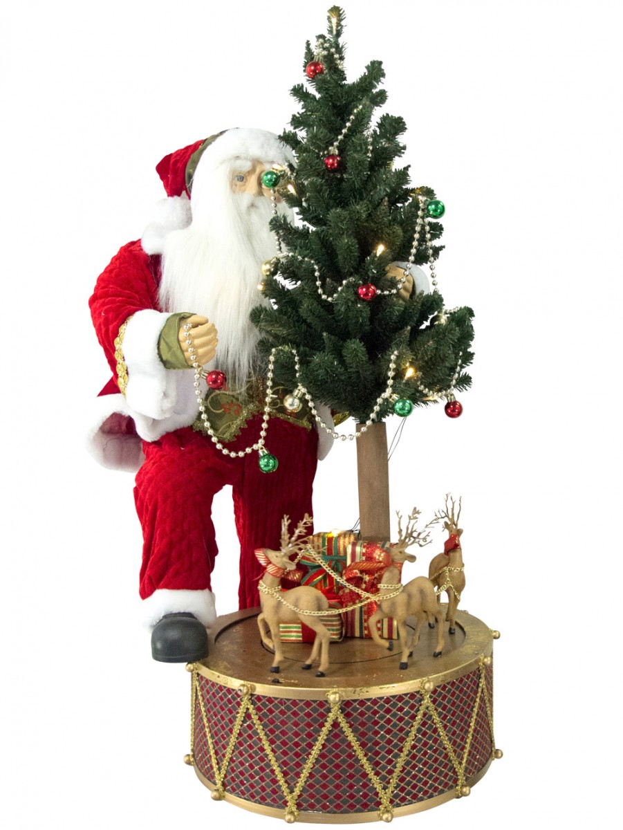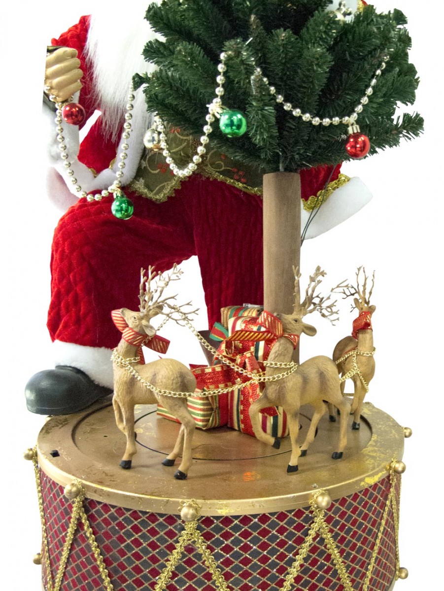 You will see Santa Claus wearing the famous red dress and sporting the white beard with an additional decoration of a gold braid which is placed on an animated drum. The miniature doll is placed on reindeers and tin sleigh which rotates around a Christmas tree decorated with LED lights and trinket garlands. There is an on/off switch which you can use to play the jingle bell tune which plays for a long 15 minutes after which the music is automatically turned off. The product complies with Australian safety and performance requirements, so you know it is safe to use in Australia. It is a great gift you can give away on the Christmas.