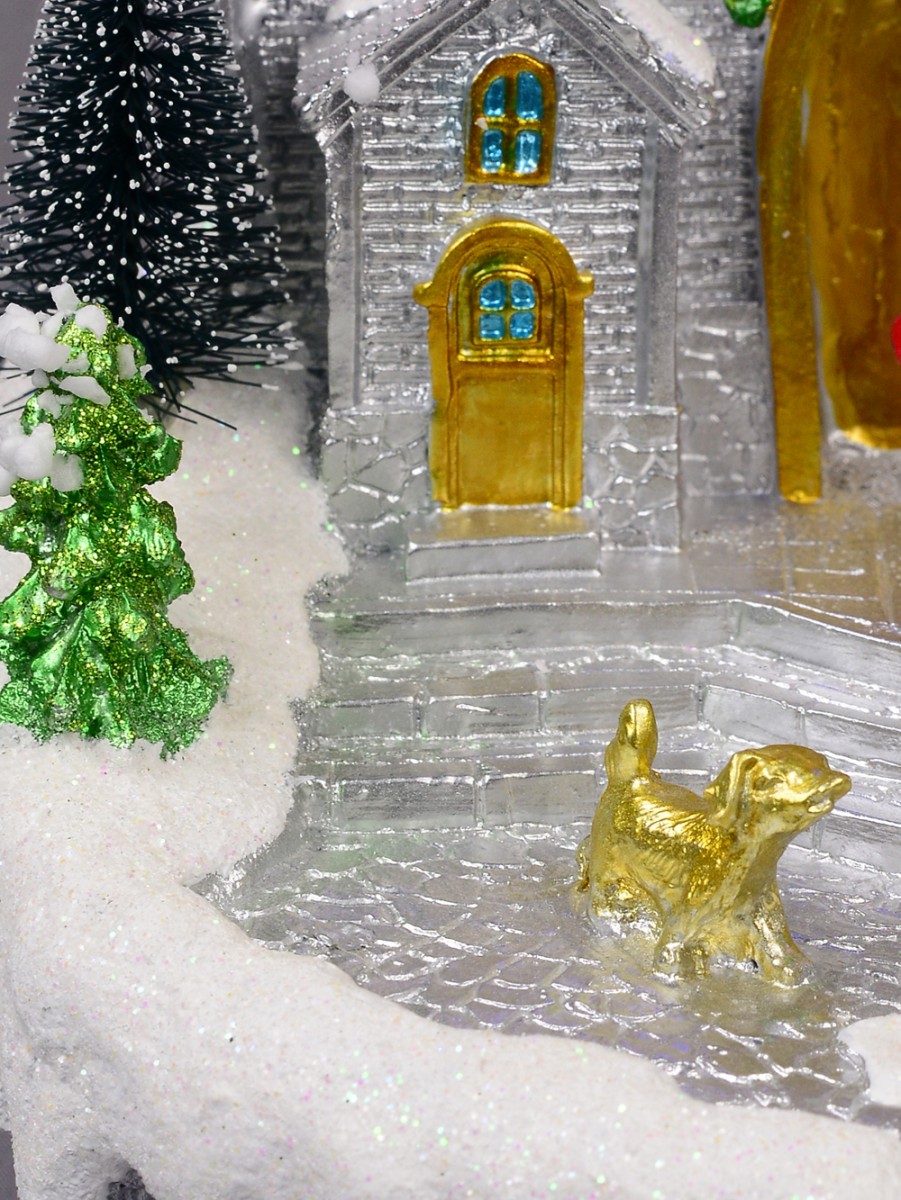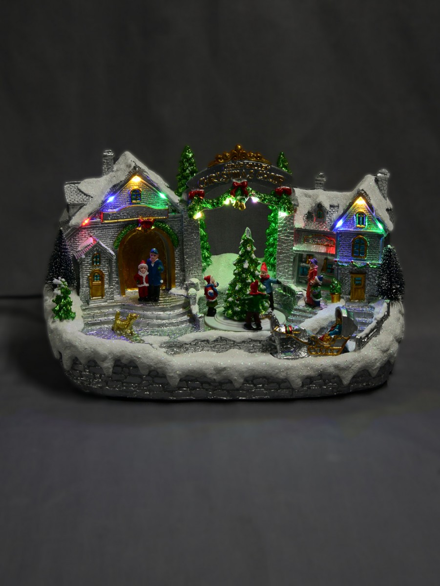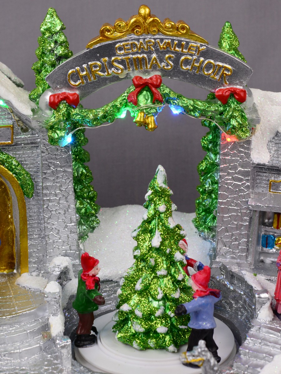 Enrich your home decoration with this skilfully depicted version of Santa's workshop. The Illuminated & Animated Santa's Workshop At Cedar Valley Scene is a table top ornament and gift item which depicts the dwelling place and workshop of the world famous Santa Claus. Of course, it features Christmas colours of gold, red, green and white alongside other colourful additions.
