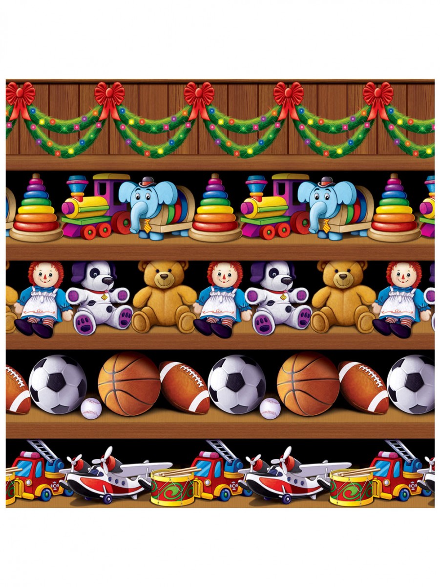 The Santa's workshop wall decal is a temporary way to brighten an entire wall with a backdrop of Christmas themed wallpaper. Children will especially be able to appreciate the Santa's workshop theme. A shelf built into a wall with wooden paneling is the perfect storage space for toys in Santa's workshop. The top of the shelf is decorated with evergreen garlands and Christmas lights tied off with red ribbon. On the top shelf is row after row of stacking rings and toy trains. The shelf below that is reserved for dollies, teddy bears, and stuffed dogs. Below that are balls of all different kinds. And the bottom shelf holds an impressive assortment of toy planes, toy fire engines, and toy drums. Hanging up the Santa's workshop wall decal behind the Christmas tree would contrast nicely and really bring the whole thing into the foreground. Or hang it on a playroom wall for colour.