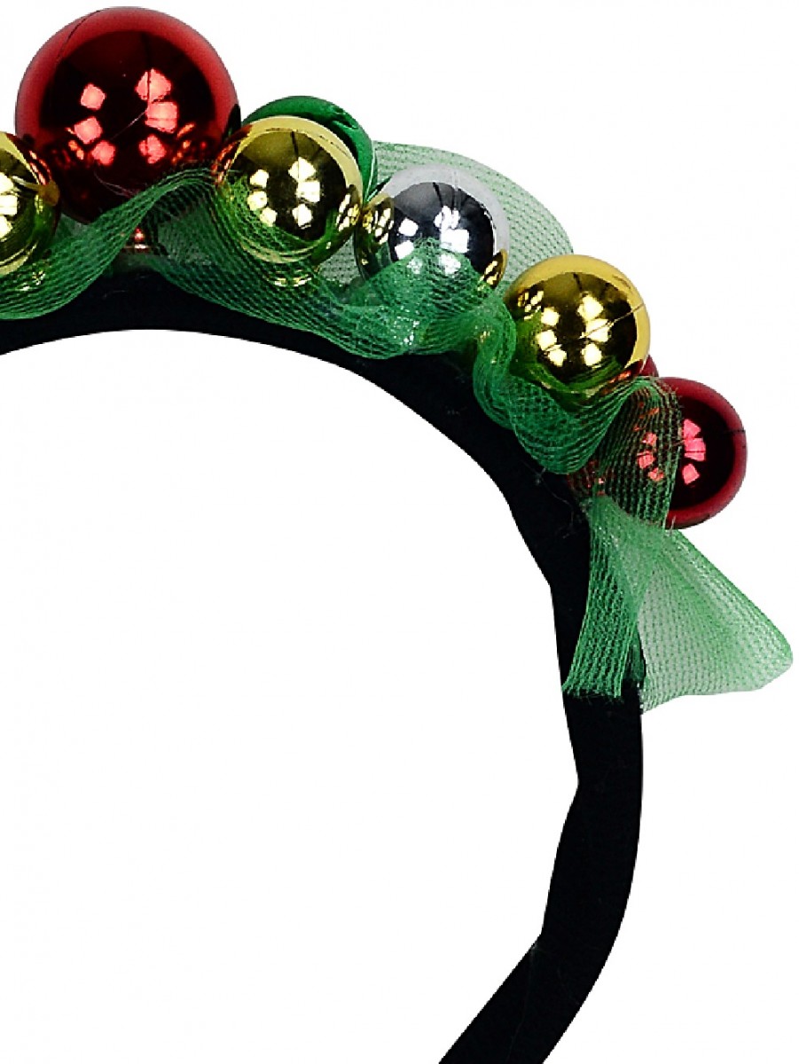 The headband features an array of two distinct bauble sizes, with three larger baubles decoratively positioned in the middle and at each end of the cluster, creating a balanced and eye-catching design. Encircling the bauble cluster is a delicate layer of green mesh fabric, adding an extra touch of holiday charm and whimsy. Its meticulous craftsmanship ensures that each headband is a unique creation, slightly varying from the image and dimensions provided, ensuring that no two are exactly alike.