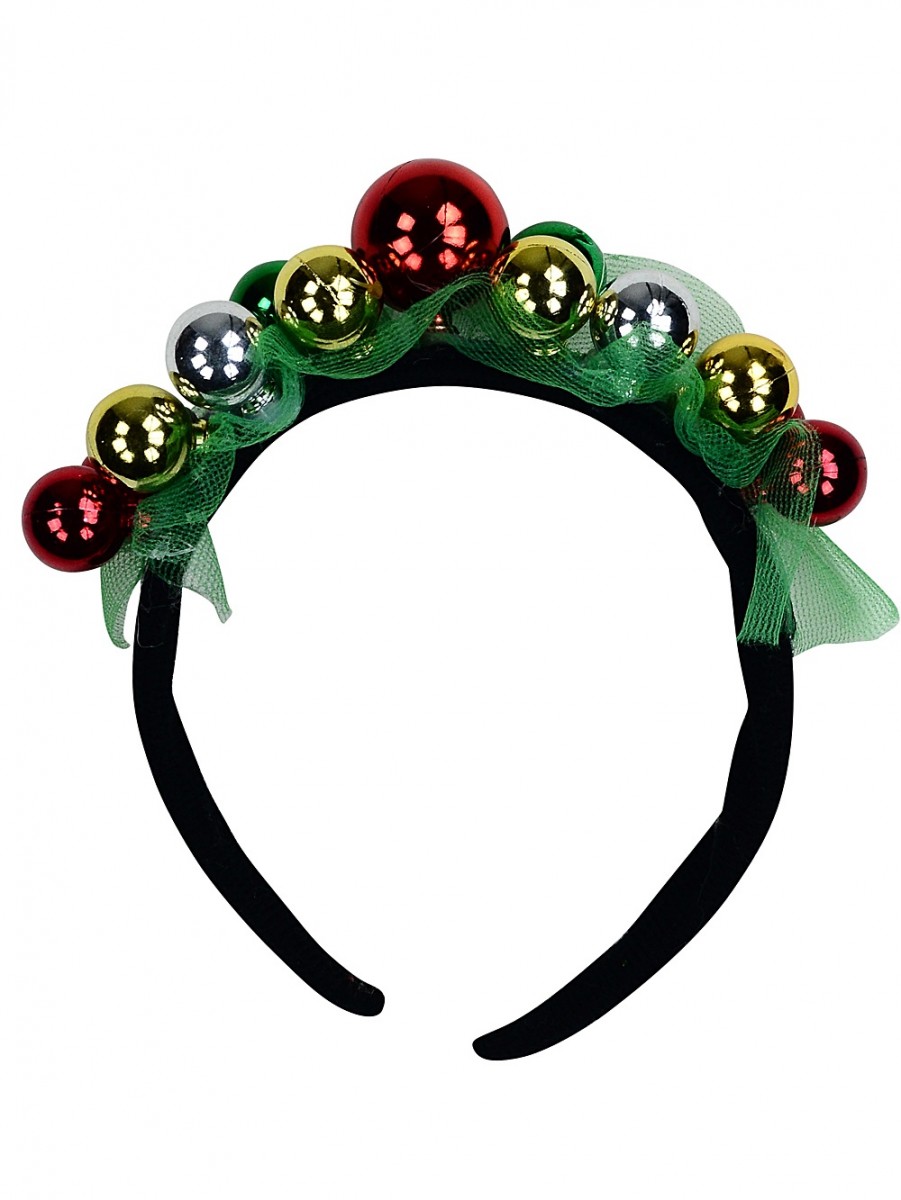 Transform your holiday celebrations into a realm of festive magic with the Shiny Red, Gold, Silver & Green Christmas Baubles Headband. This stunning accessory, designed with holiday cheer in mind, will captivate the attention of everyone at your festive gatherings. Measuring 15cm by 17cm, this exquisitely crafted headband showcases a harmonious blend of metallic baubles in vibrant red, elegant gold, glistening silver, and lush green atop a sleek black band.