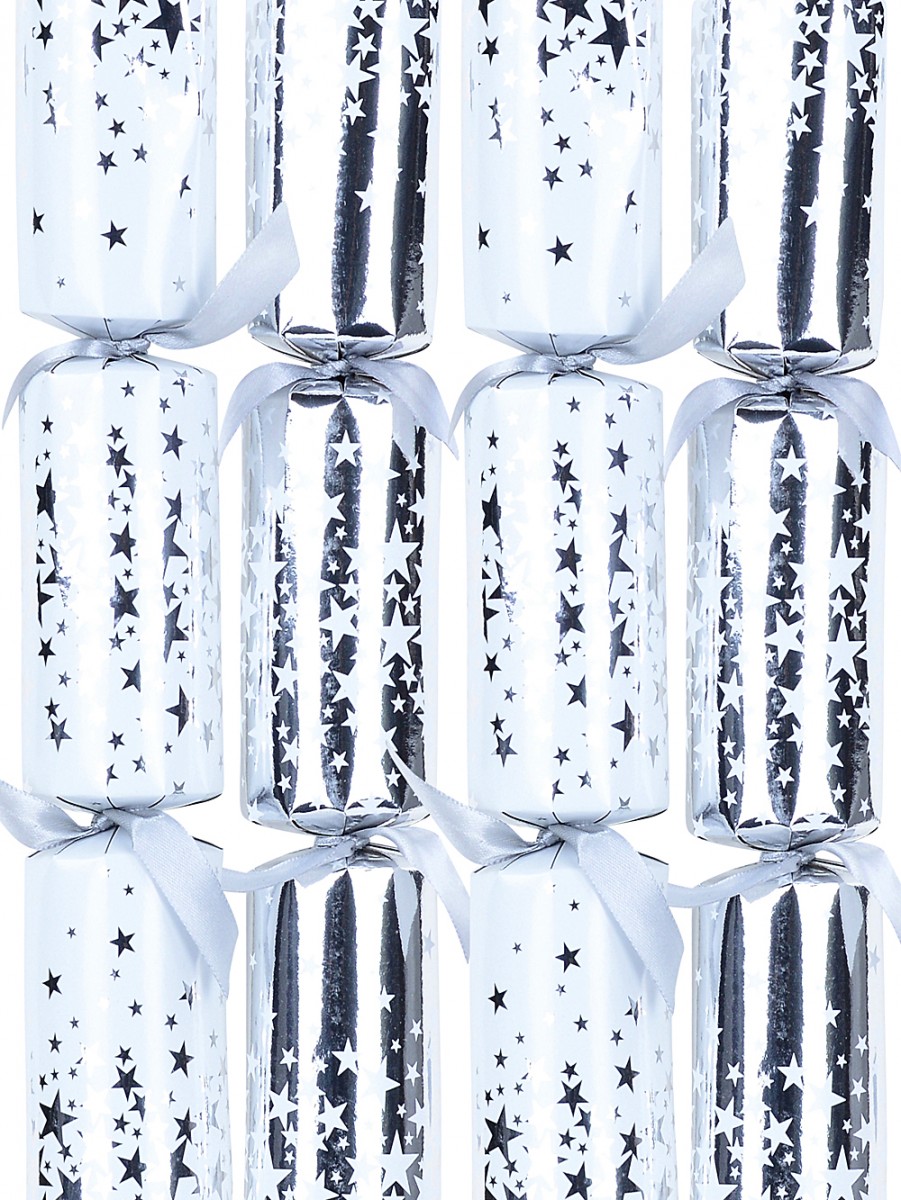 Each cracker measures 50mm x 50mm x 30cm and boasts a sophisticated design in shimmering white and silver. The intricate star patterns vary in size, adding a touch of elegance and whimsy to your Christmas celebrations. Wrapped with silky silver ribbons at the twist, these crackers not only look beautiful but promise an exciting surprise inside with every pull.