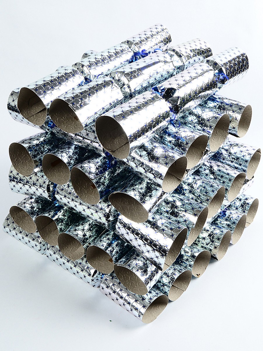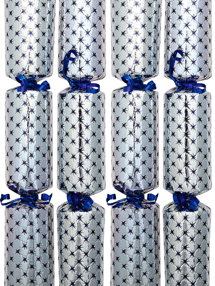 Each cracker is meticulously crafted and sealed with a brilliant blue shiny ribbon at the twists, ensuring a secure and polished finish. This sophisticated design not only enhances the aesthetic appeal but guarantees a delightful anticipation as guests pull them apart. Inside each bon bon, expect a pleasant surprise: a snap, a small gift, a festive hat, and a joke – everything you need to ignite joy and laughter around your Christmas dinner table.