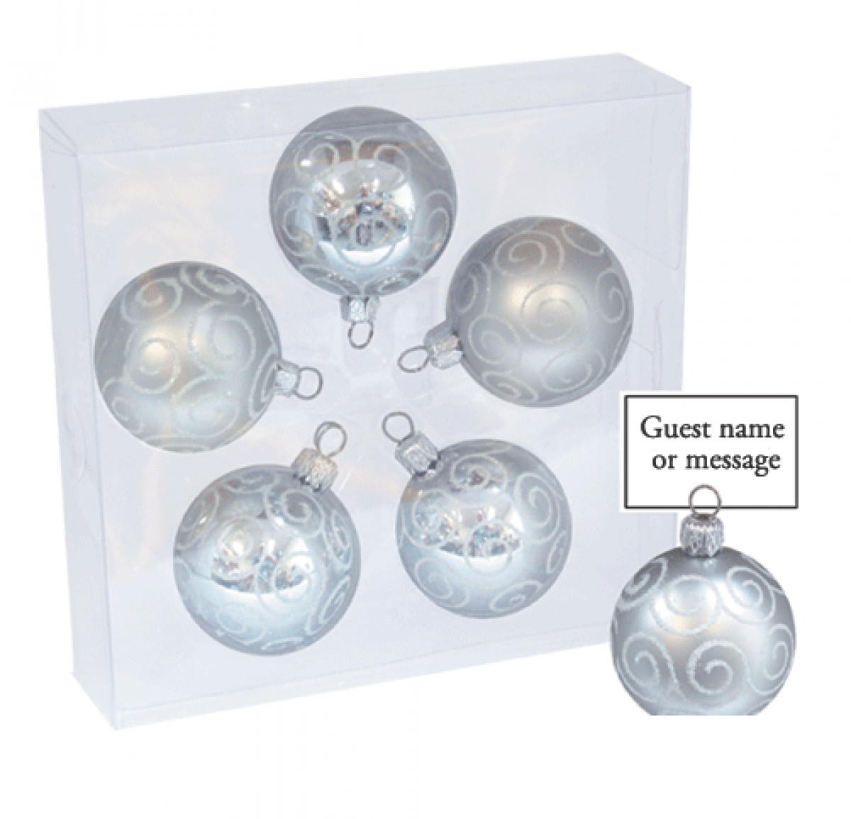 These baubles may look like simple Christmas tree decorations from afar, but close up you'll see that they're far more than that. Each of these five baubles features a special metal holder perfect for holding a name tag, Christmas card, or even a thoughtful message or note. The baubles measure 5cm across, and feature a flat bottom to ensure that they don't topple over. Each bauble is patterned with a swirling double hook pattern in glittering silver. Three of the baubles feature a metallic finish, and two a matte finish. These Christmas decorations are the perfect choice for organising your seating arrangements or for writing a personal note to your loved ones. You could also slip a photo into each holder and dot them around the house. They would also make a great mini-gift or Kris Kringle present, or could be used as part of a Christmas-day treasure hunt for the kids. This Christmas you'll want to show your guests how much you care. And what better way that with a bauble named in their honour?