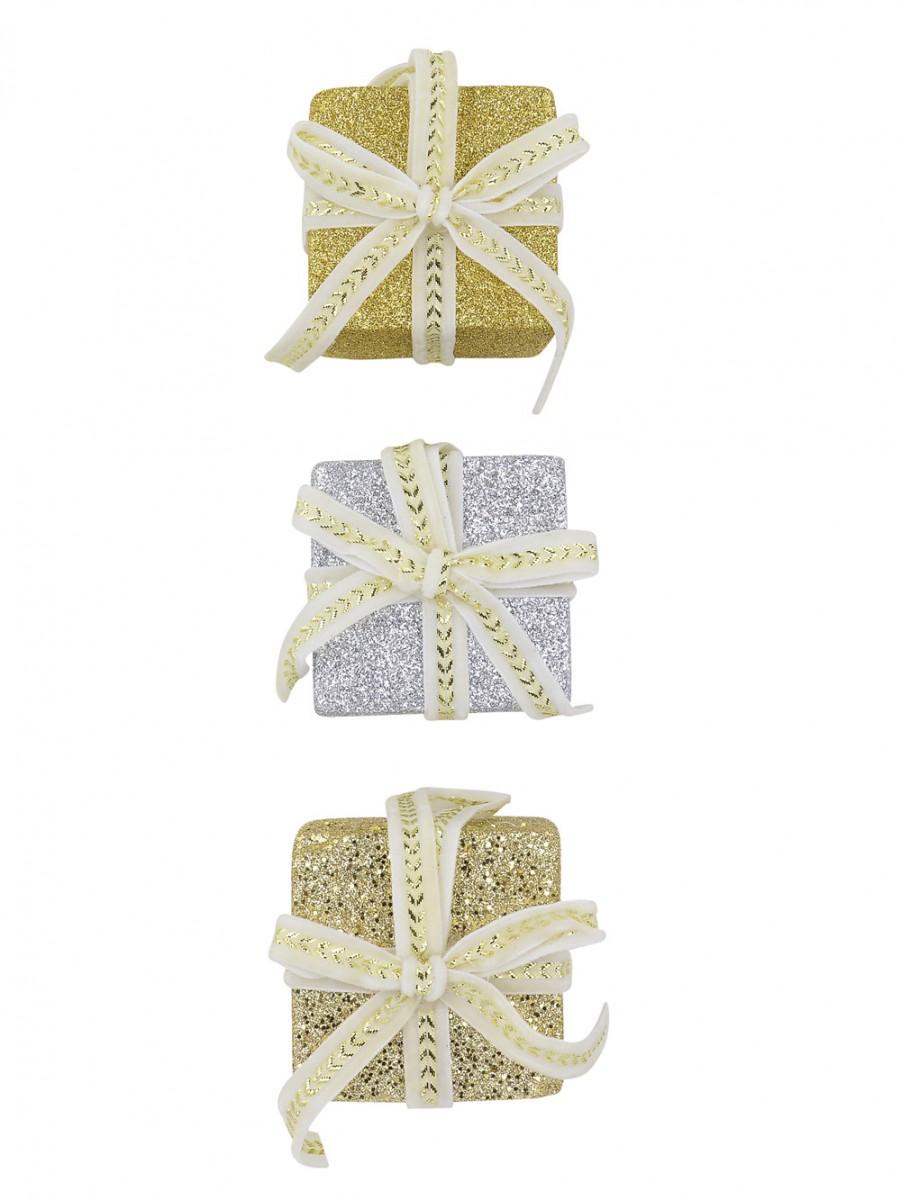 What's the worth of a Christmas tree without gifts beneath it? And what's the worth of that tree if we don't decorate it ornaments that could attract gifts? We're talking here of Gold & Silver Glitter Present Hanging Ornaments with Ivory & Gold Ribbon, which comes in sets of 3