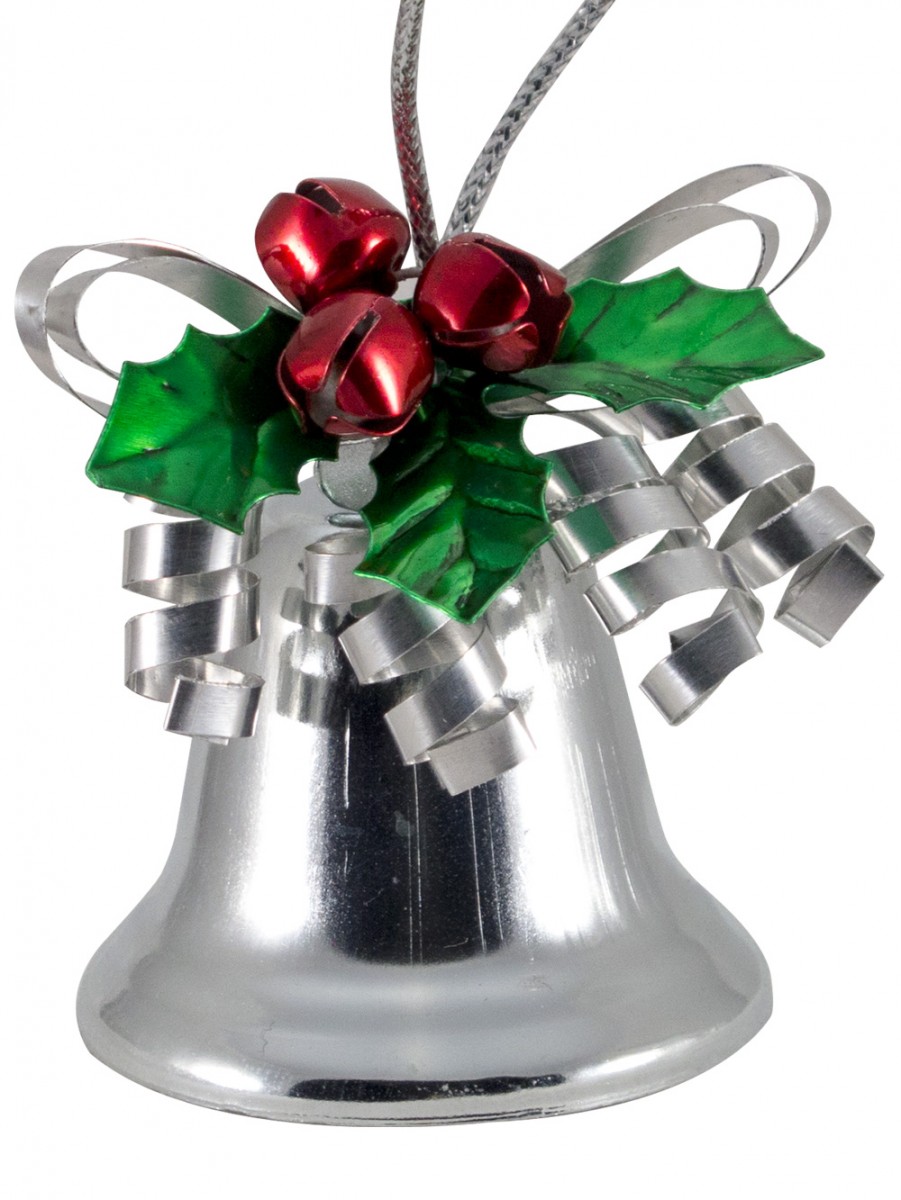 Spanning an ideal 60mm by 46mm, these miniature silver bells are the perfect addition to your tree and existing Christmas decorations. They can be lined up along the mantle to bring a little sparkle to your fireplace, or hung on your front door to inspire holiday cheer with each ring. The silver liberty bell ornament is decorated with green holly leaves and little red bells, as well as silver ribbon.