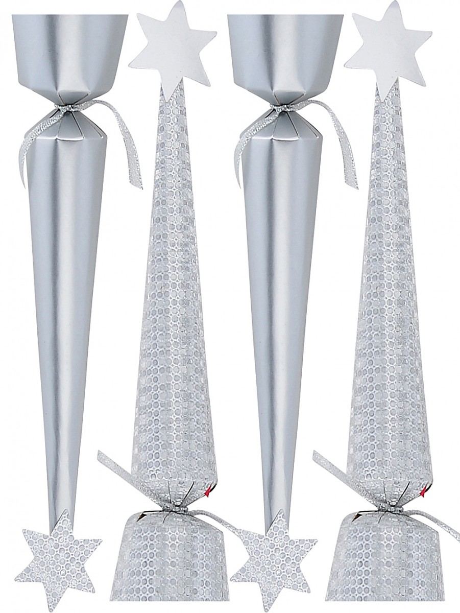 The Silver Matte & Shiny Circle Pattern Christmas Tree Cracker Bon Bons is a pack of 8 conical shaped Christmas crackers with a decorative flourish that would attract and charm the hearts of every family member, friend, neighbour, co-worker, general acquaintance, and just about anyone else who you make the kind gesture of giving. Their face will light up with happiness the moment they see it. Its exterior and content are a source of festive excitement.