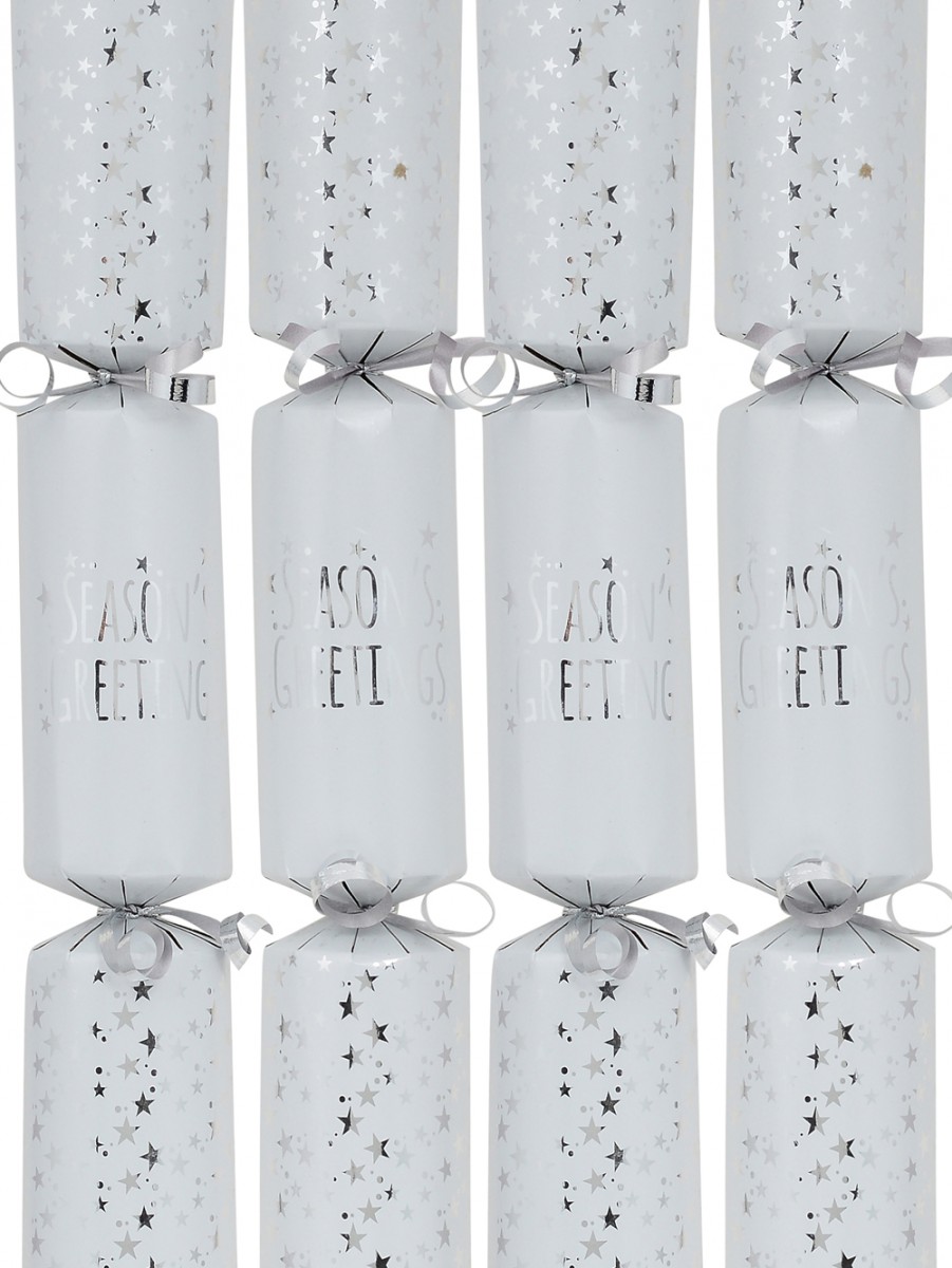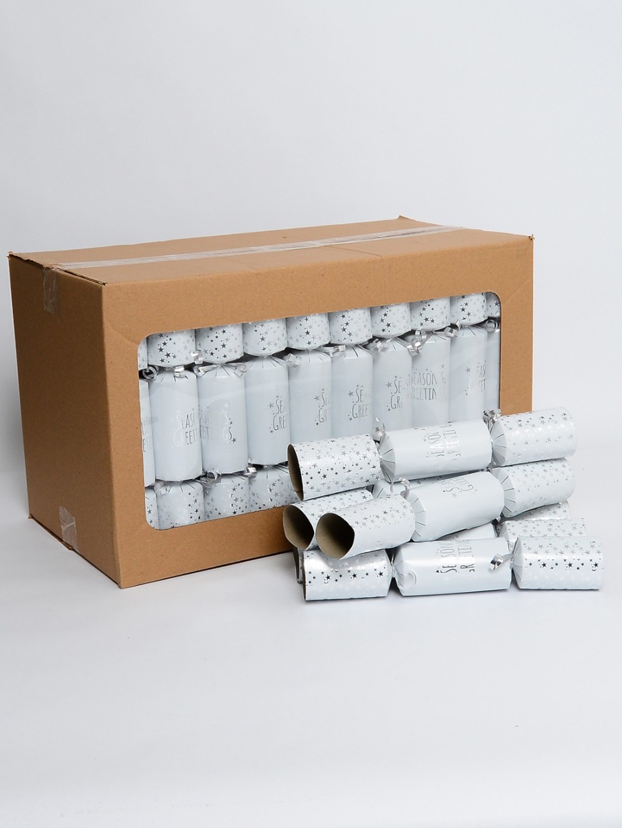 The Silver Season's Greetings Text On White Christmas Cracker Bon Bons features bright party hats and silly jokes that truly capture the spirit of Christmas. The simple colour scheme of these crackers allows them to match the overall aesthetics of your decorations, ensuring a cohesive and stylish look.