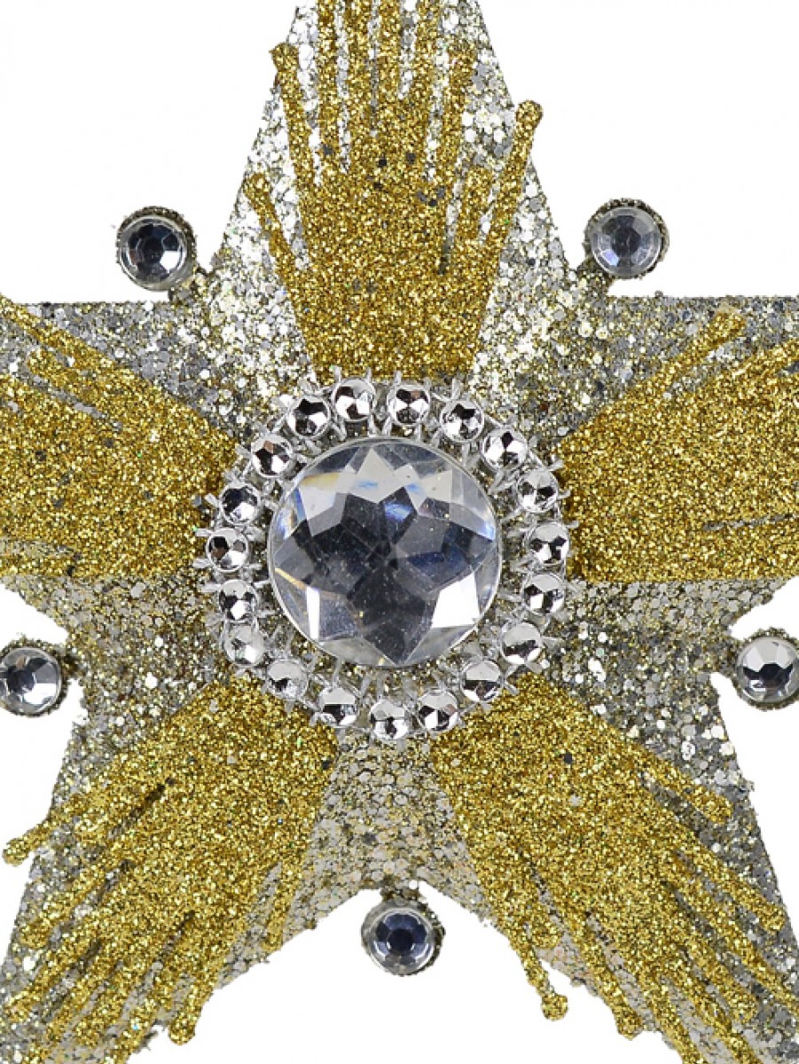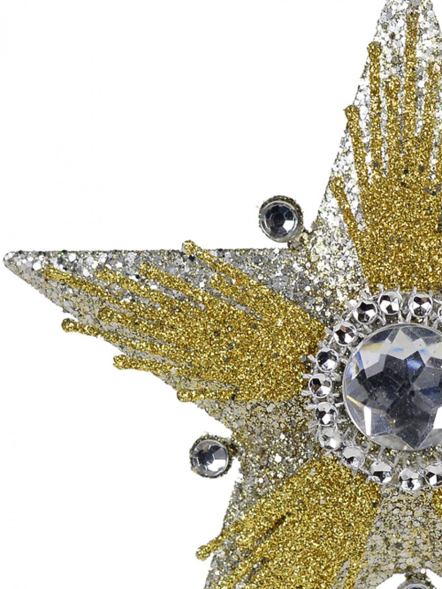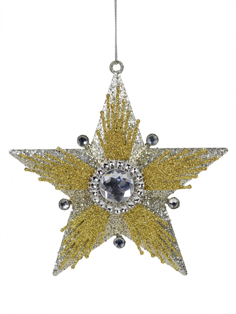 Exotic and enchanting, this diamante embellished silver with gold glitter hanging star is constructed with an intricate layered design with a silver glittered base and a smaller gold glitter layer on top of it. Hanging from a thin silver string attachment in its top eyelet, this exquisite and sparkling ornament is ideal for both Yuletide celebrations and for special event decorations throughout the year.
