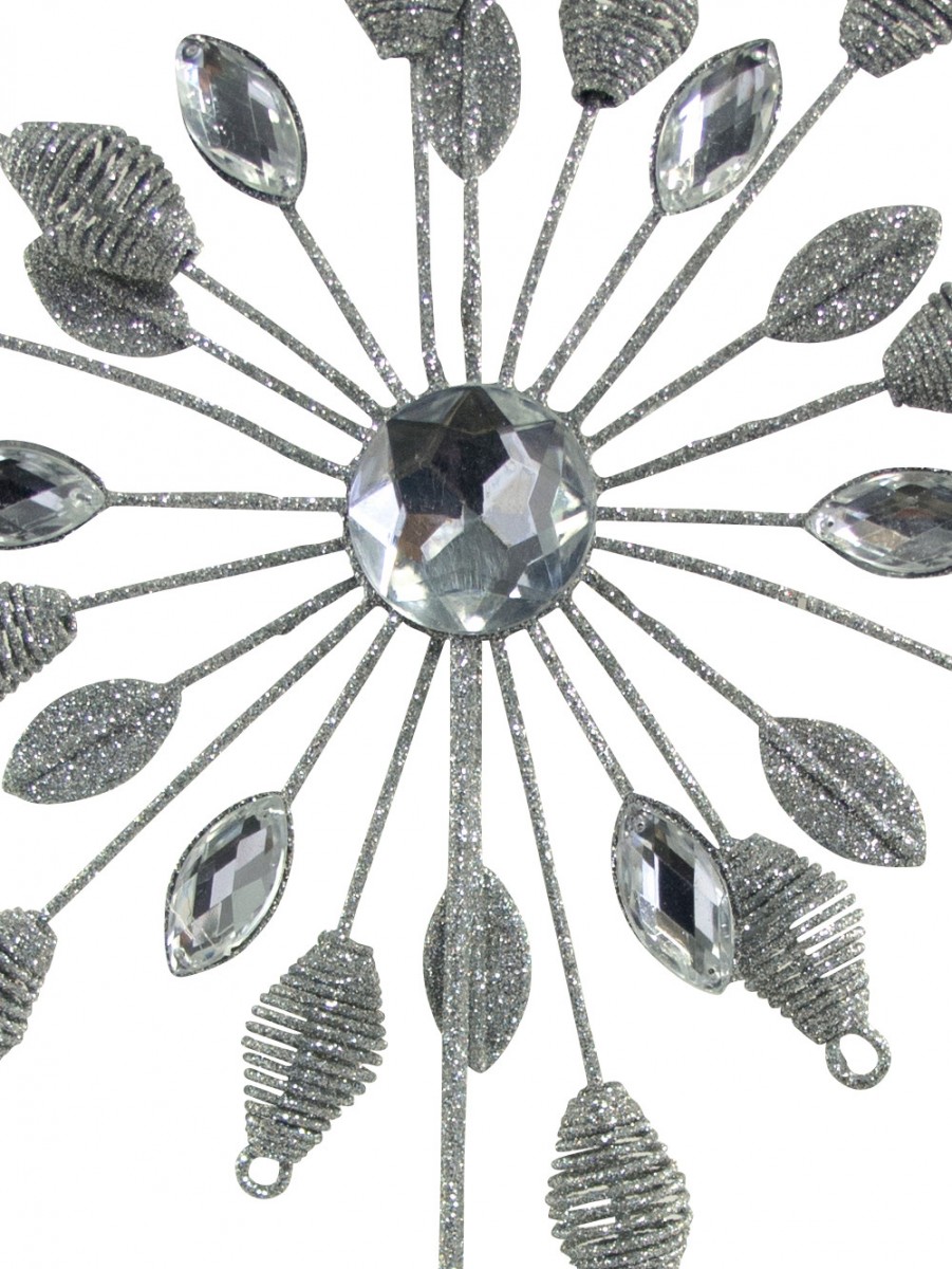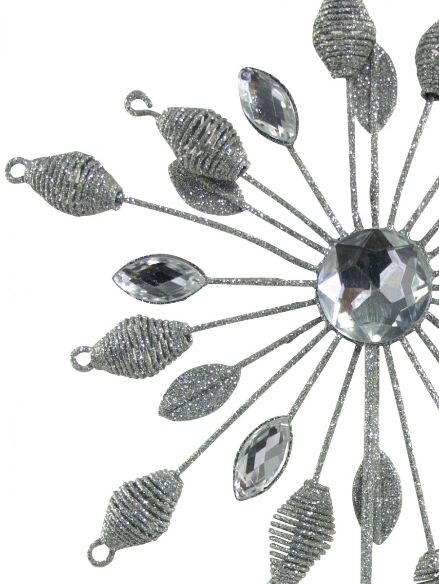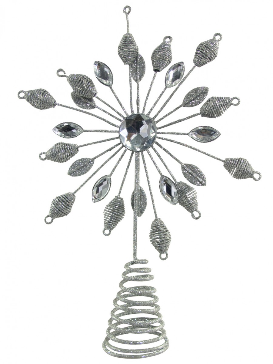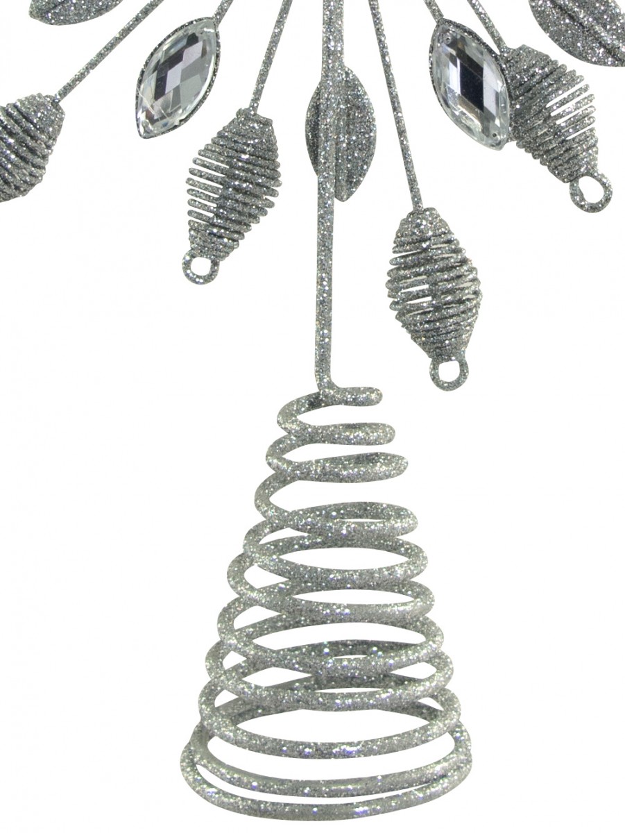 This modern take on the traditional Christmas star at the top of a Christmas tree is absolutely stunning when used as a finishing touch on any well adorned tree. The decoration is in a starburst shape with a big jewel centre and many little rays coming out of it in a star pattern. Each ray is covered in silver sparkles and adorned on the end with either a diamond shaped jewel or a diamond shaped coil. The base of the tree top decoration is also covered in silver glitter and has a large coil at the bottom that is made to make the mounting process easier.