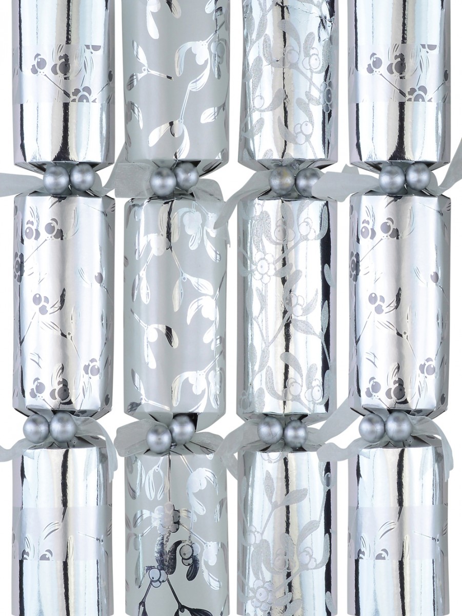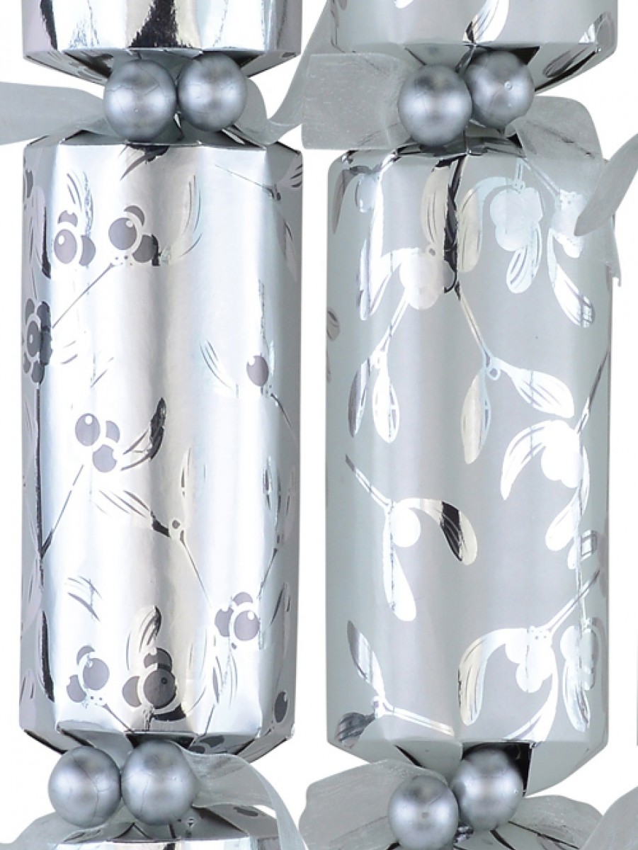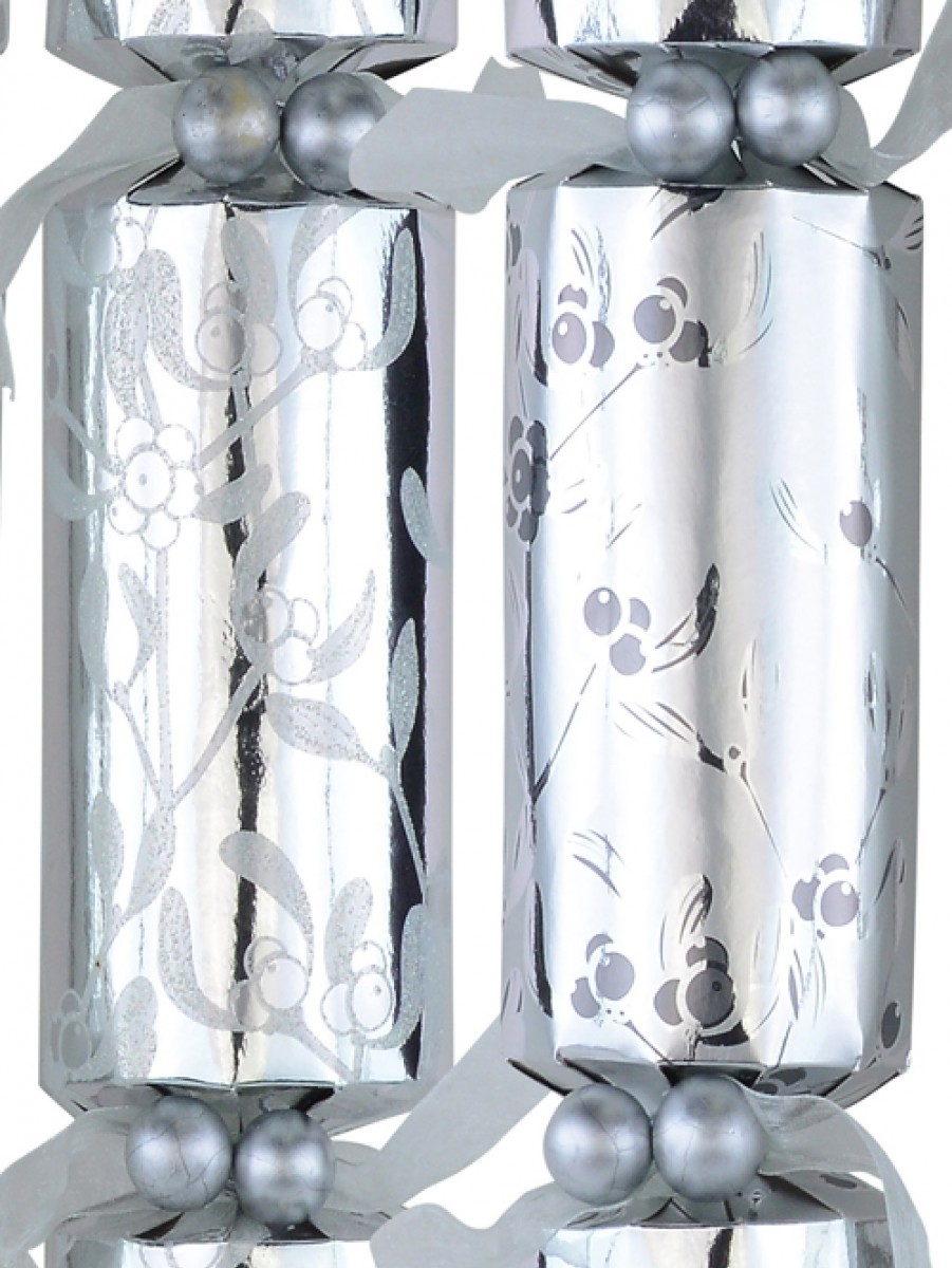 This shiny and matte silver and white luxury bon bons with a Christmas berry wine pattern design will be a fantastic decorative piece for the holiday season. These bon bons come in three different designs. The one design pattern consists of a glittering silver berry vine on a bright silver background. The second design pattern is a shiny silver berry vine on a matte silver background. Last, the final design pattern features a shiny silver berry vine on white. They are sealed with white mesh ribbon with silver berries at twists to complement their style. The fact that each Christmas cracker includes a snap, gift, cap, and a fun slip with a joke and quote is an exciting aspect of this product. This lovely Christmas cracker is ideal for Christmas dinner or lunch in both December and July! This item is sold in a set of 6 for your wonderful decoration!!