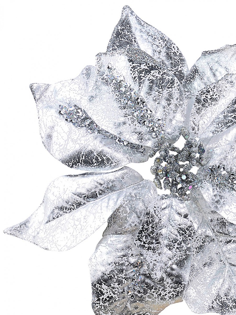 Our exquisite Silver Poinsettia Clip-On is undeniably stunning and beautifully crafted with white petals accentuated with silver glitter and small gold and silver sequined embellishments. It has a clip for easy attachment while decorating so you can arrange it as you like and is 28cm in length and breadth.